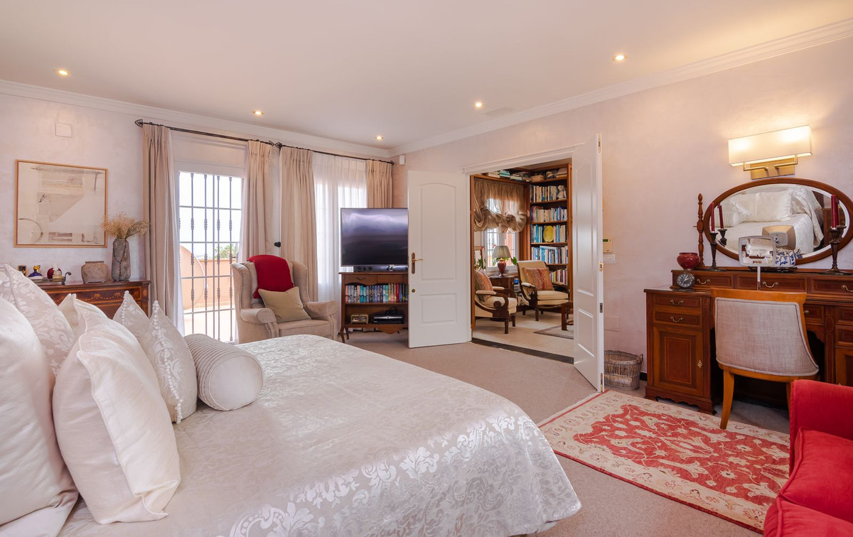 If we go up to the second floor we find a reception area that gives access to a large main room, completely private from the rest of the house, in it we have a bathroom with all the necessities en suite and a large L-shaped dressing room. Here we have access to a terrace with great views of the pool, sea, mountains of Mijas and golf course.