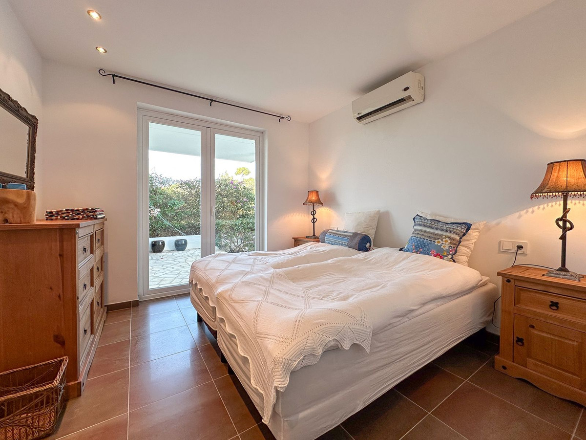 The ground floor features an open kitchen and living area, where light and space take center stage. Here you’ll also find two bedrooms, each with their own en-suite bathroom – ideal for family or guests. This floor has direct access to a covered terrace with glass curtains, which can be opened to let the fresh breeze flow in. From here, there is further access to a large private terrace with a beautiful pool, surrounded by vegetation, making the ground floor perfect for outdoor living.