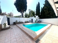 The main residence is impressively spacious, featuring a large living room with patio doors that open onto a shaded terrace—perfect for outdoor dining and relaxation. This area flows directly to the pool and sun terraces. The fully equipped kitchen offers ample storage and is ideally suited for catering to guests.