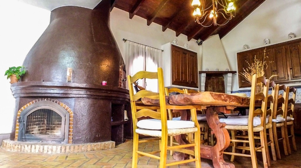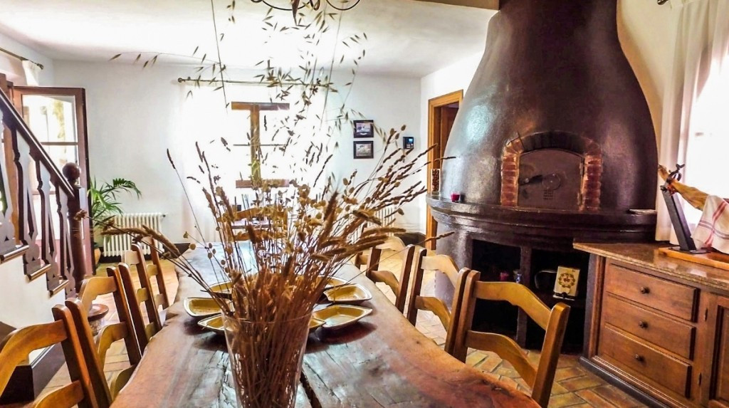 Ground floor: Entrance hall, office, large kitchen with fireplace and wood oven, two living rooms, both with fireplaces, large dining area and one bathroom. There are two interior courtyards.