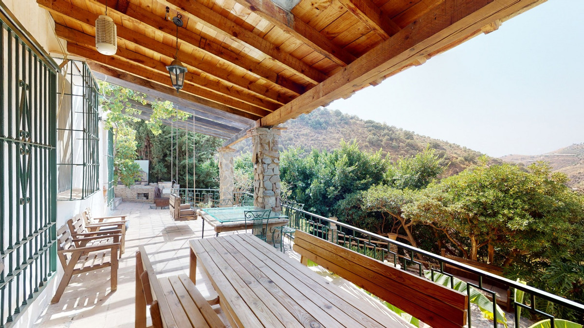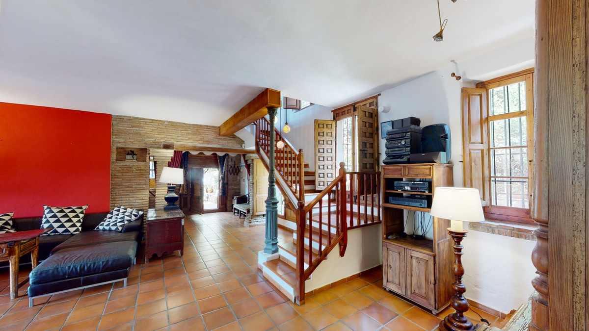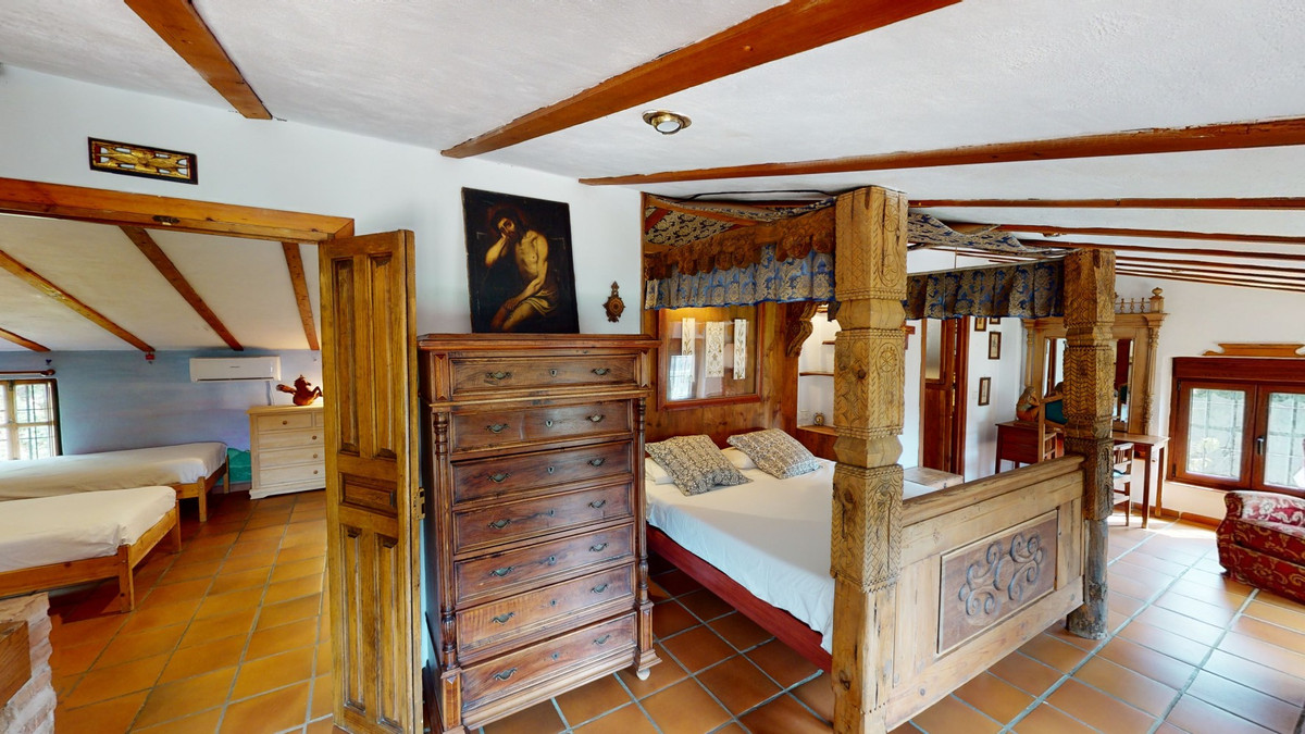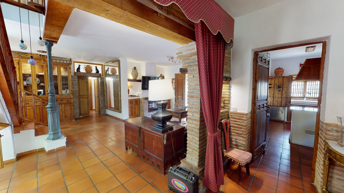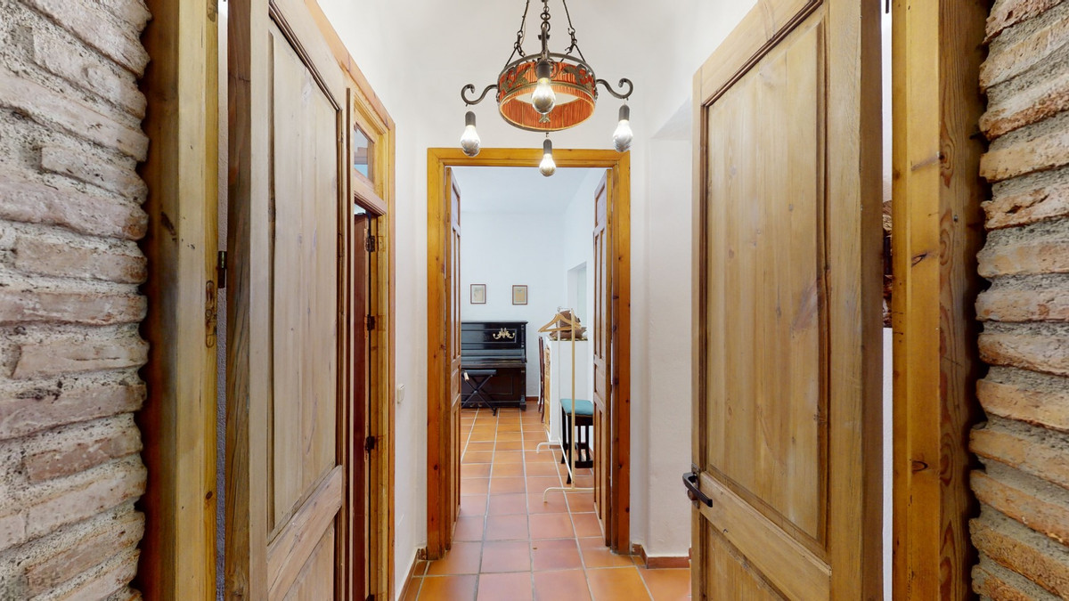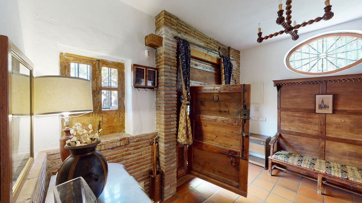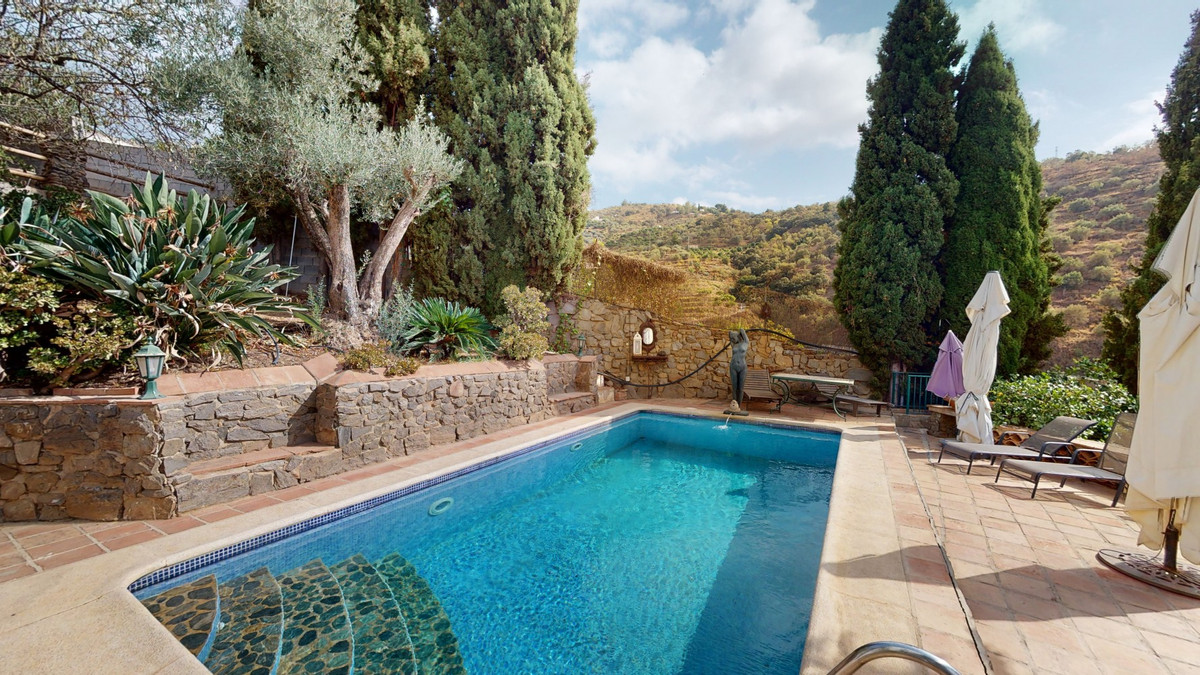 A property with charm, soul and tradition, surrounded by nature on all four sides and with panoramic views to the southwest, the valley and the surrounding mountains. It consists of two floors. The current owner built it to his liking in 1996, with top quality materials and noble woods. The estate is accessed through an electric gate and there is space to park at least three vehicles at the entrance. In front of this area, we find several tree-lined paths, for relaxed strolls, and a 500-year-old marble fountain. Going down a ramp, with little slope, covered by a leafy vine and another fountain, we access a front patio. Here is the front door; a century-old solid wood door. Upon entering, to the right, is the kitchen, fully equipped and with access to the outside covered terrace. In front of the main door is the living-dining room, very spacious, bright and with a fireplace. From the living room there is also access to the covered terrace. After the living room we access the bedroom area on the ground floor, where we find two double bedrooms, a guest bedroom, and a bathroom. Going up the stairs to the second floor there are another three bedrooms -one with a conservatory overlooking the valley and the mountains-, a bathroom with a round hydromassage bathtub and a storage room. The outdoor area has lush gardens, a beautiful pool, barbecue area, a horse arena, and its boxes. We are pleased to be able to present this dream property to you soon, either personally or via virtual viewing. Because this world, it is unique - just like our Axarquía. In Andalusia. On the Costa del Sol. Here, on the sunny side of life...