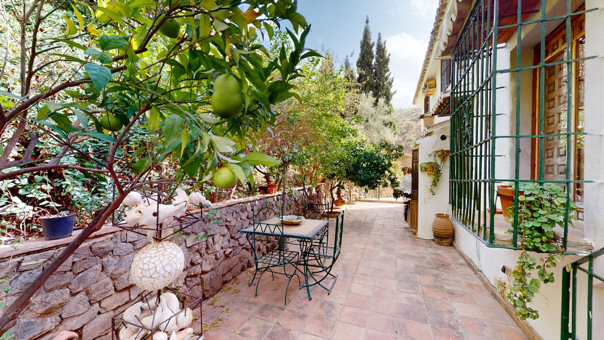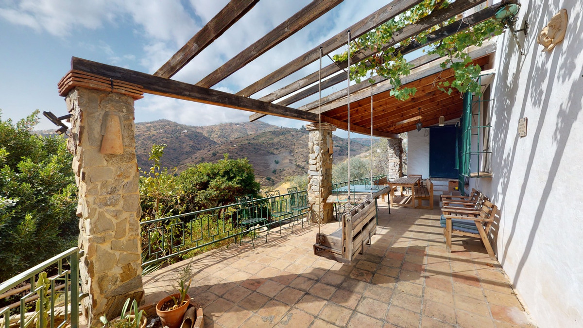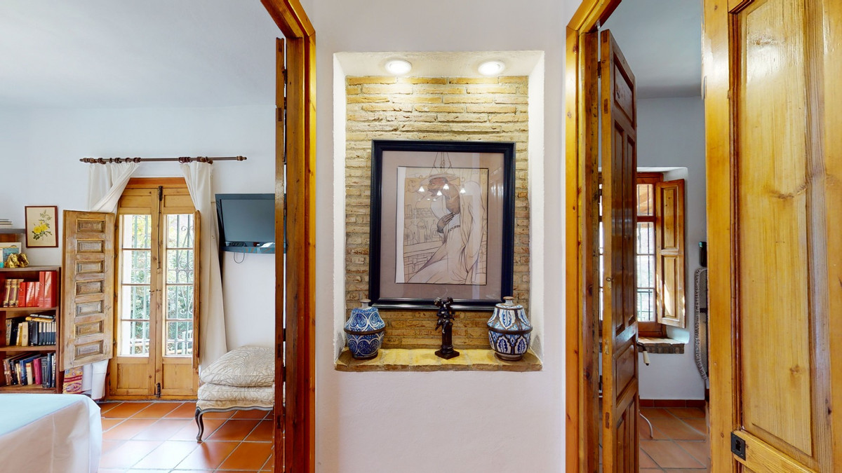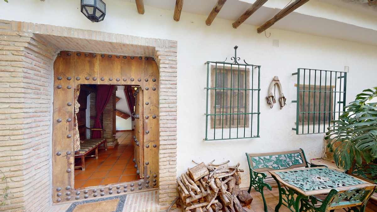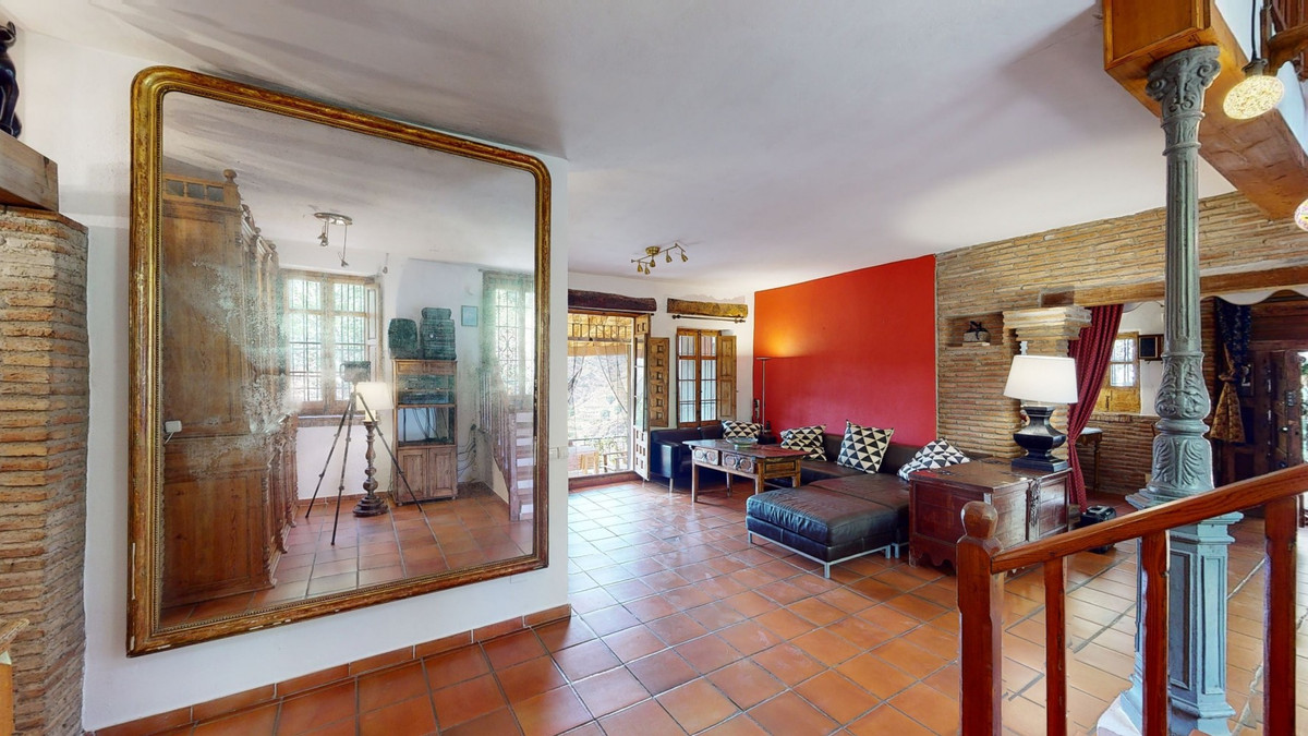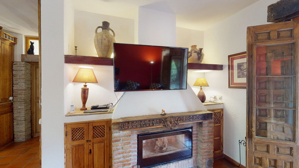 A property with charm, soul and tradition, surrounded by nature on all four sides and with panoramic views to the southwest, the valley and the surrounding mountains. It consists of two floors. The current owner built it to his liking in 1996, with top quality materials and noble woods. The estate is accessed through an electric gate and there is space to park at least three vehicles at the entrance. In front of this area, we find several tree-lined paths, for relaxed strolls, and a 500-year-old marble fountain. Going down a ramp, with little slope, covered by a leafy vine and another fountain, we access a front patio. Here is the front door; a century-old solid wood door. Upon entering, to the right, is the kitchen, fully equipped and with access to the outside covered terrace. In front of the main door is the living-dining room, very spacious, bright and with a fireplace. From the living room there is also access to the covered terrace. After the living room we access the bedroom area on the ground floor, where we find two double bedrooms, a guest bedroom, and a bathroom. Going up the stairs to the second floor there are another three bedrooms -one with a conservatory overlooking the valley and the mountains-, a bathroom with a round hydromassage bathtub and a storage room. The outdoor area has lush gardens, a beautiful pool, barbecue area, a horse arena, and its boxes. We are pleased to be able to present this dream property to you soon, either personally or via virtual viewing. Because this world, it is unique - just like our Axarquía. In Andalusia. On the Costa del Sol. Here, on the sunny side of life...