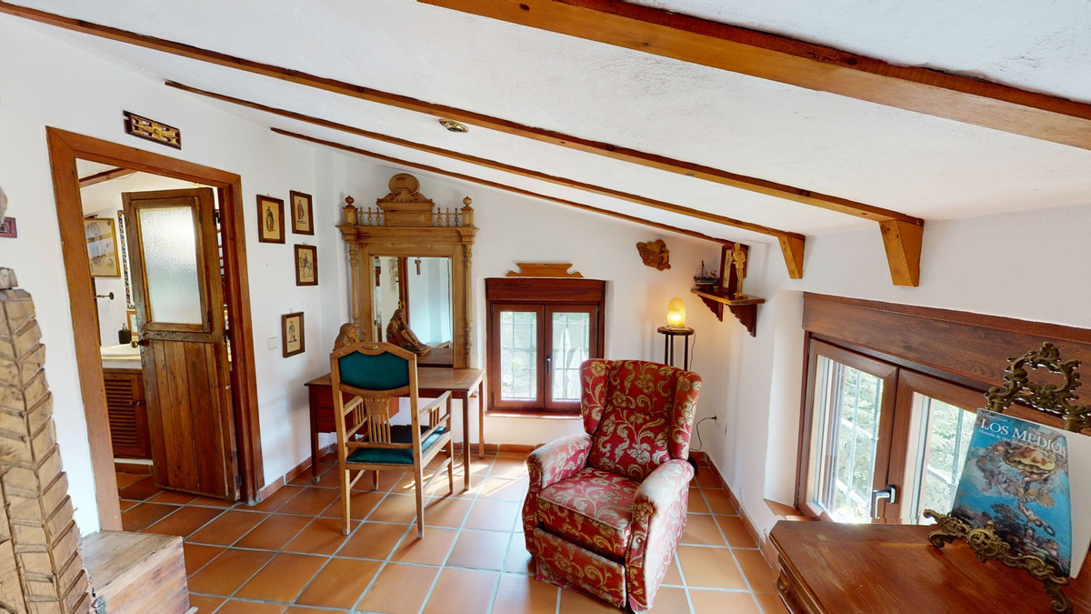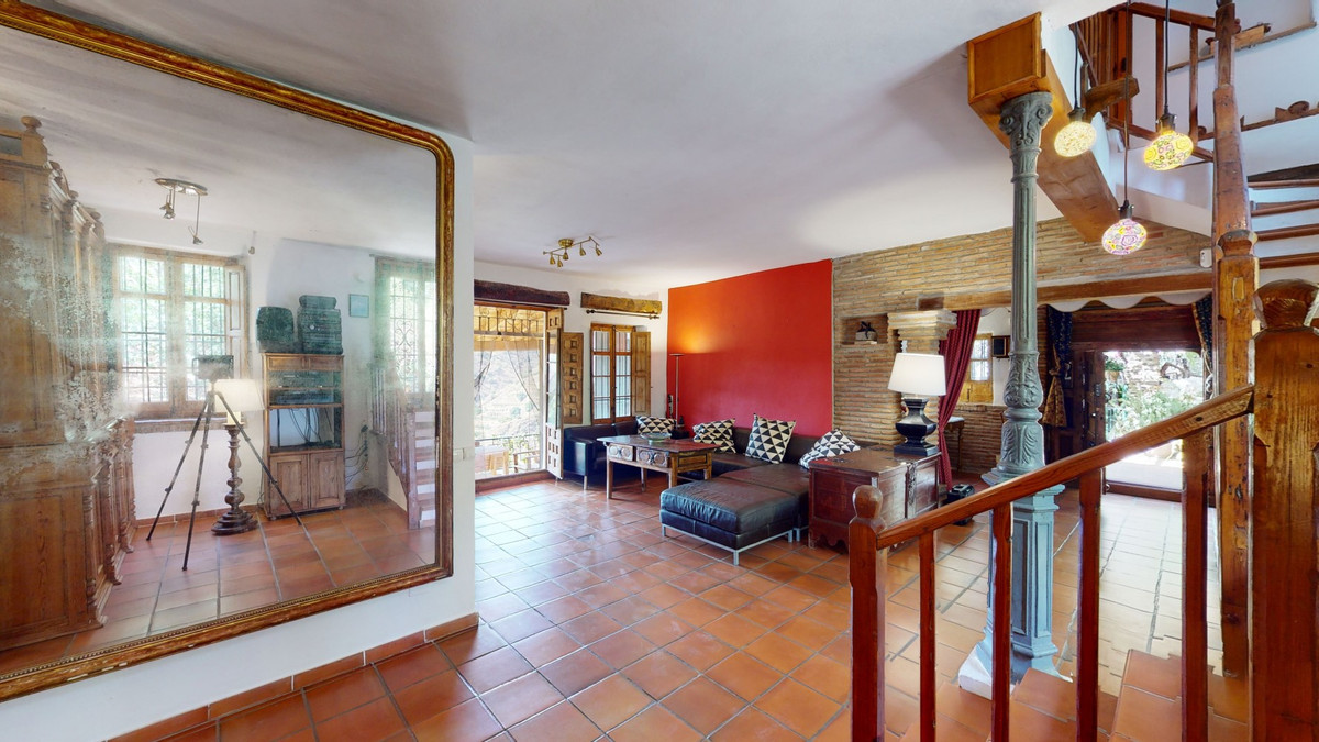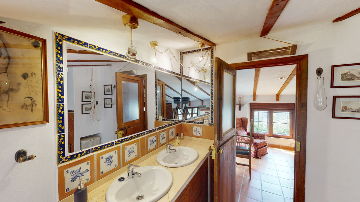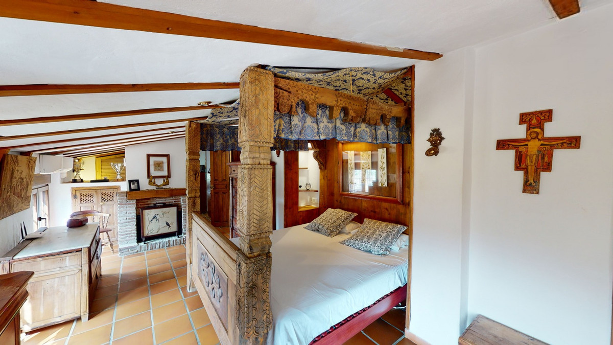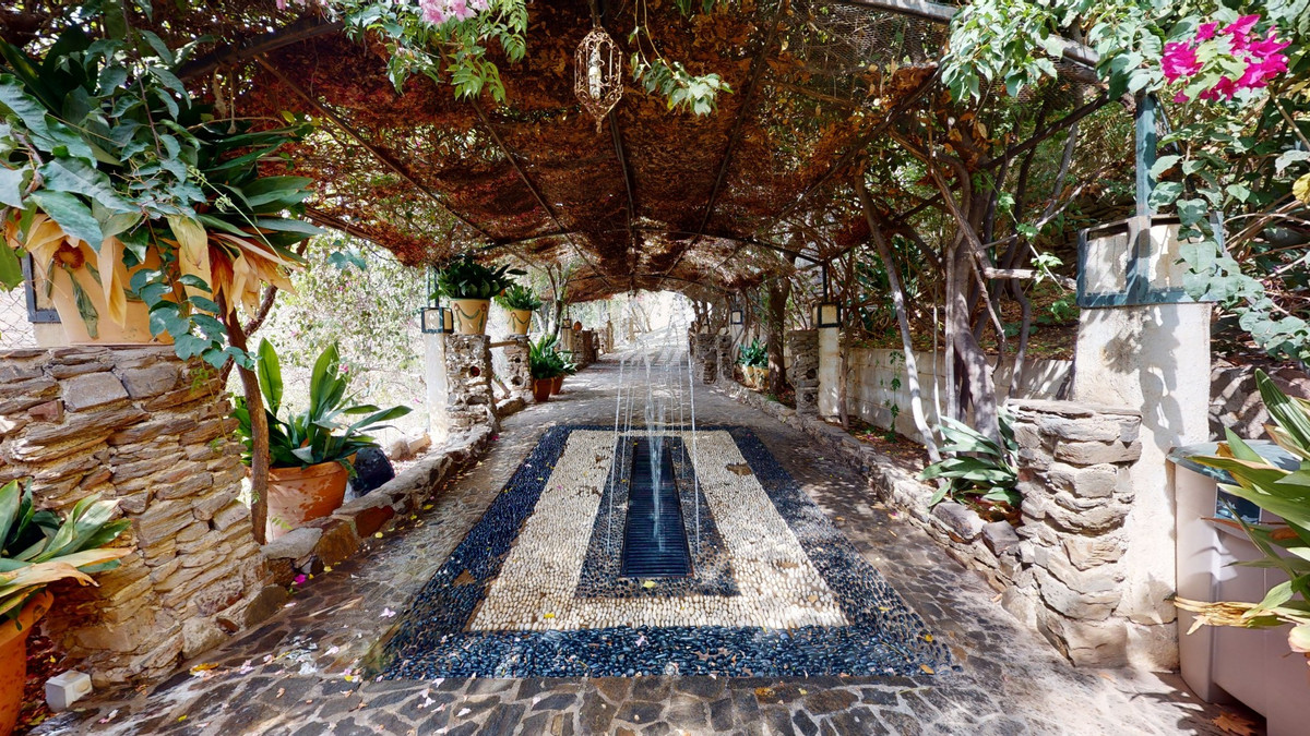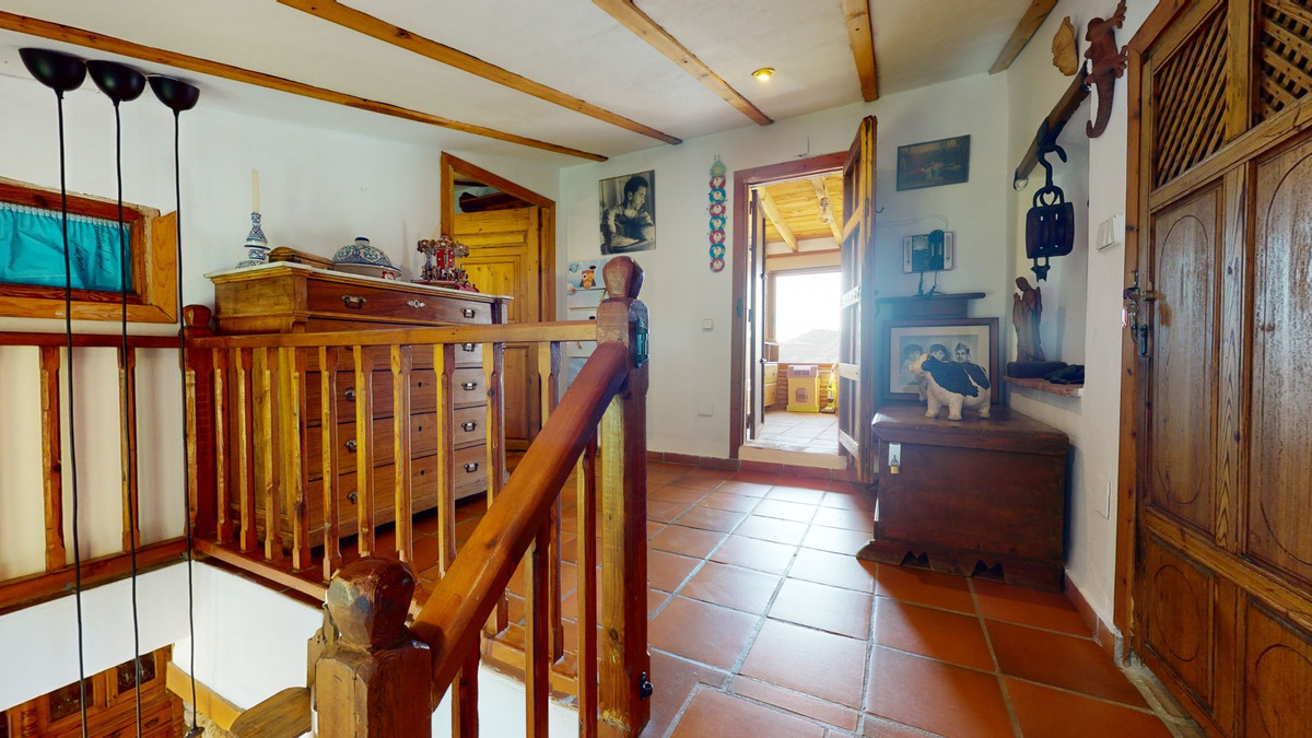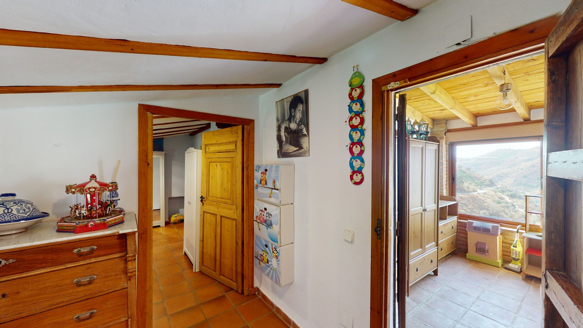 A property with charm, soul and tradition, surrounded by nature on all four sides and with panoramic views to the southwest, the valley and the surrounding mountains. It consists of two floors. The current owner built it to his liking in 1996, with top quality materials and noble woods. The estate is accessed through an electric gate and there is space to park at least three vehicles at the entrance. In front of this area, we find several tree-lined paths, for relaxed strolls, and a 500-year-old marble fountain. Going down a ramp, with little slope, covered by a leafy vine and another fountain, we access a front patio. Here is the front door; a century-old solid wood door. Upon entering, to the right, is the kitchen, fully equipped and with access to the outside covered terrace. In front of the main door is the living-dining room, very spacious, bright and with a fireplace. From the living room there is also access to the covered terrace. After the living room we access the bedroom area on the ground floor, where we find two double bedrooms, a guest bedroom, and a bathroom. Going up the stairs to the second floor there are another three bedrooms -one with a conservatory overlooking the valley and the mountains-, a bathroom with a round hydromassage bathtub and a storage room. The outdoor area has lush gardens, a beautiful pool, barbecue area, a horse arena, and its boxes. We are pleased to be able to present this dream property to you soon, either personally or via virtual viewing. Because this world, it is unique - just like our Axarquía. In Andalusia. On the Costa del Sol. Here, on the sunny side of life...