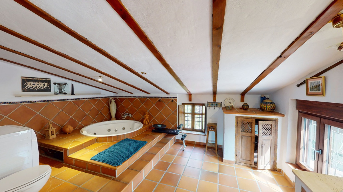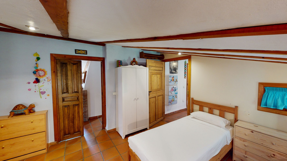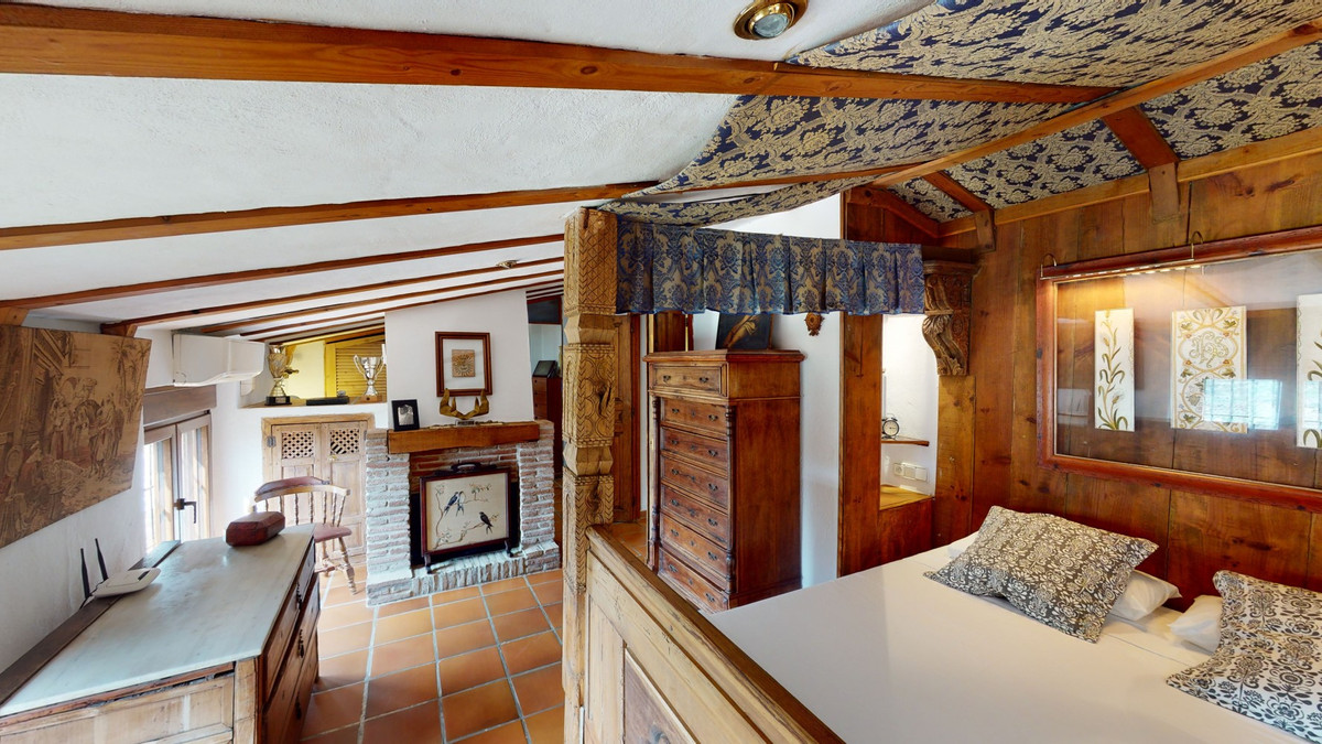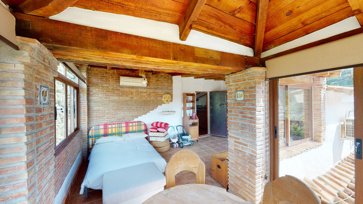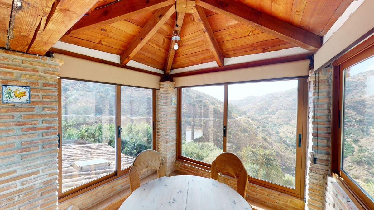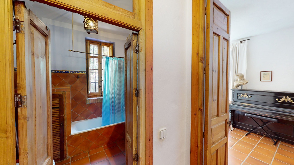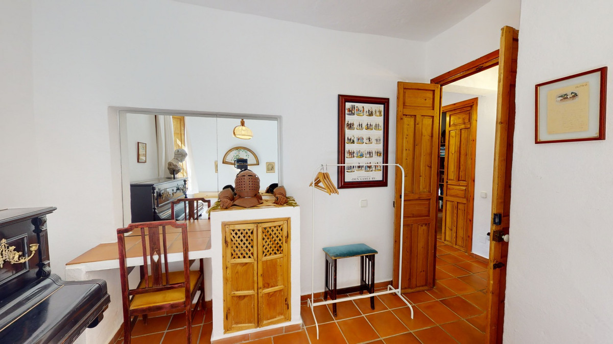 A property with charm, soul and tradition, surrounded by nature on all four sides and with panoramic views to the southwest, the valley and the surrounding mountains. It consists of two floors. The current owner built it to his liking in 1996, with top quality materials and noble woods. The estate is accessed through an electric gate and there is space to park at least three vehicles at the entrance. In front of this area, we find several tree-lined paths, for relaxed strolls, and a 500-year-old marble fountain. Going down a ramp, with little slope, covered by a leafy vine and another fountain, we access a front patio. Here is the front door; a century-old solid wood door. Upon entering, to the right, is the kitchen, fully equipped and with access to the outside covered terrace. In front of the main door is the living-dining room, very spacious, bright and with a fireplace. From the living room there is also access to the covered terrace. After the living room we access the bedroom area on the ground floor, where we find two double bedrooms, a guest bedroom, and a bathroom. Going up the stairs to the second floor there are another three bedrooms -one with a conservatory overlooking the valley and the mountains-, a bathroom with a round hydromassage bathtub and a storage room. The outdoor area has lush gardens, a beautiful pool, barbecue area, a horse arena, and its boxes. We are pleased to be able to present this dream property to you soon, either personally or via virtual viewing. Because this world, it is unique - just like our Axarquía. In Andalusia. On the Costa del Sol. Here, on the sunny side of life...