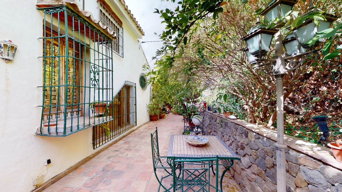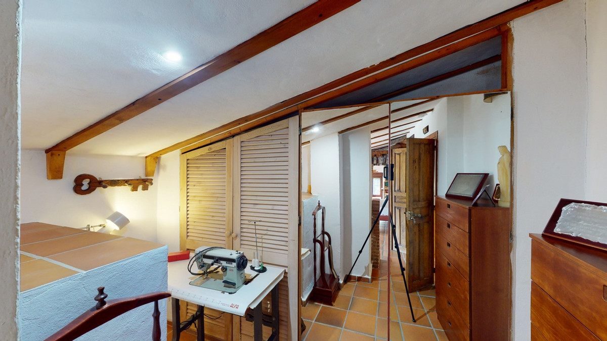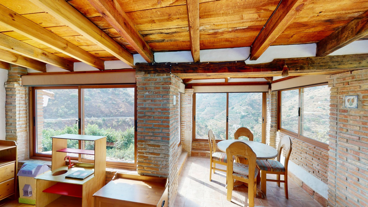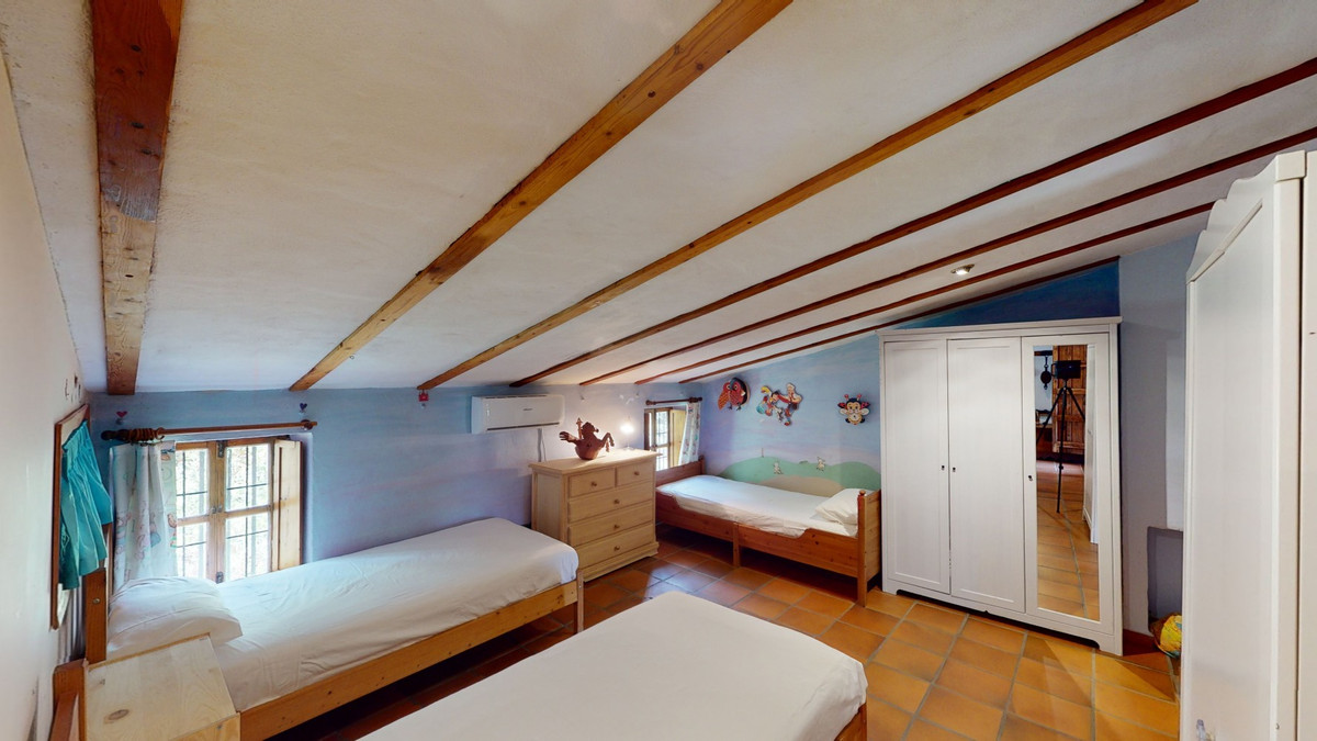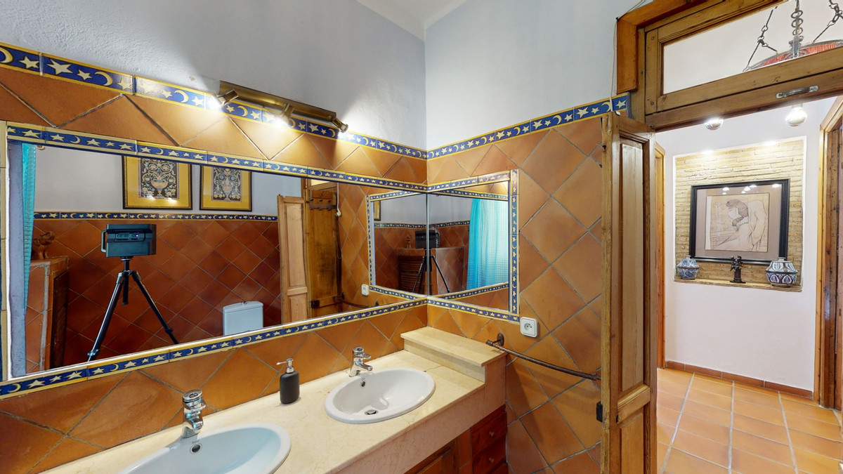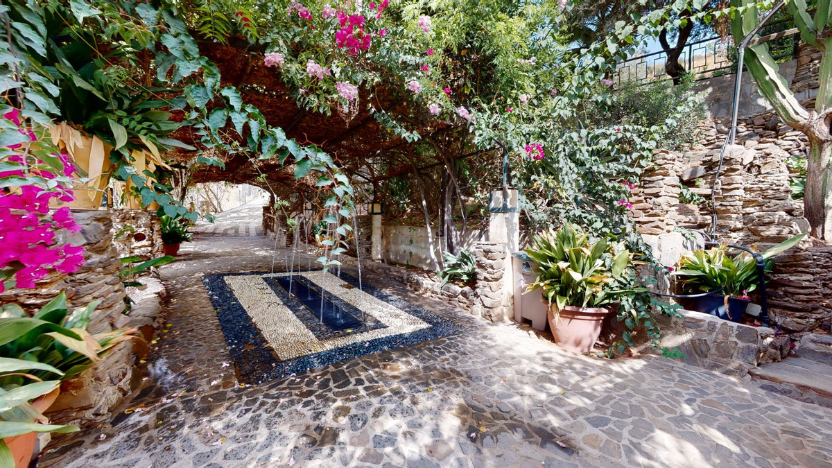 A property with charm, soul and tradition, surrounded by nature on all four sides and with panoramic views to the southwest, the valley and the surrounding mountains. It consists of two floors. The current owner built it to his liking in 1996, with top quality materials and noble woods. The estate is accessed through an electric gate and there is space to park at least three vehicles at the entrance. In front of this area, we find several tree-lined paths, for relaxed strolls, and a 500-year-old marble fountain. Going down a ramp, with little slope, covered by a leafy vine and another fountain, we access a front patio. Here is the front door; a century-old solid wood door. Upon entering, to the right, is the kitchen, fully equipped and with access to the outside covered terrace. In front of the main door is the living-dining room, very spacious, bright and with a fireplace. From the living room there is also access to the covered terrace. After the living room we access the bedroom area on the ground floor, where we find two double bedrooms, a guest bedroom, and a bathroom. Going up the stairs to the second floor there are another three bedrooms -one with a conservatory overlooking the valley and the mountains-, a bathroom with a round hydromassage bathtub and a storage room. The outdoor area has lush gardens, a beautiful pool, barbecue area, a horse arena, and its boxes. We are pleased to be able to present this dream property to you soon, either personally or via virtual viewing. Because this world, it is unique - just like our Axarquía. In Andalusia. On the Costa del Sol. Here, on the sunny side of life...