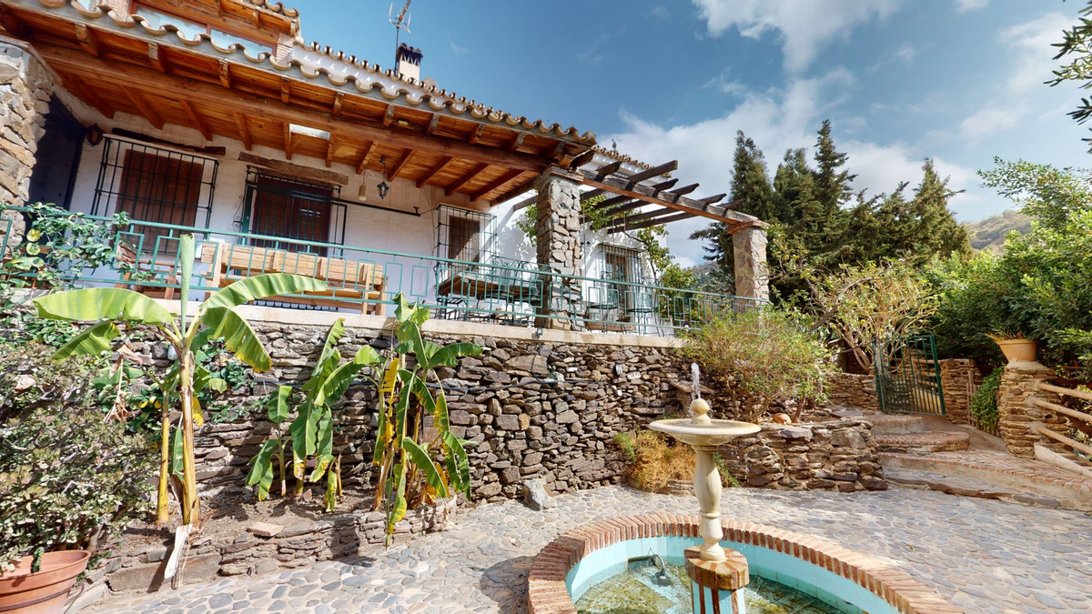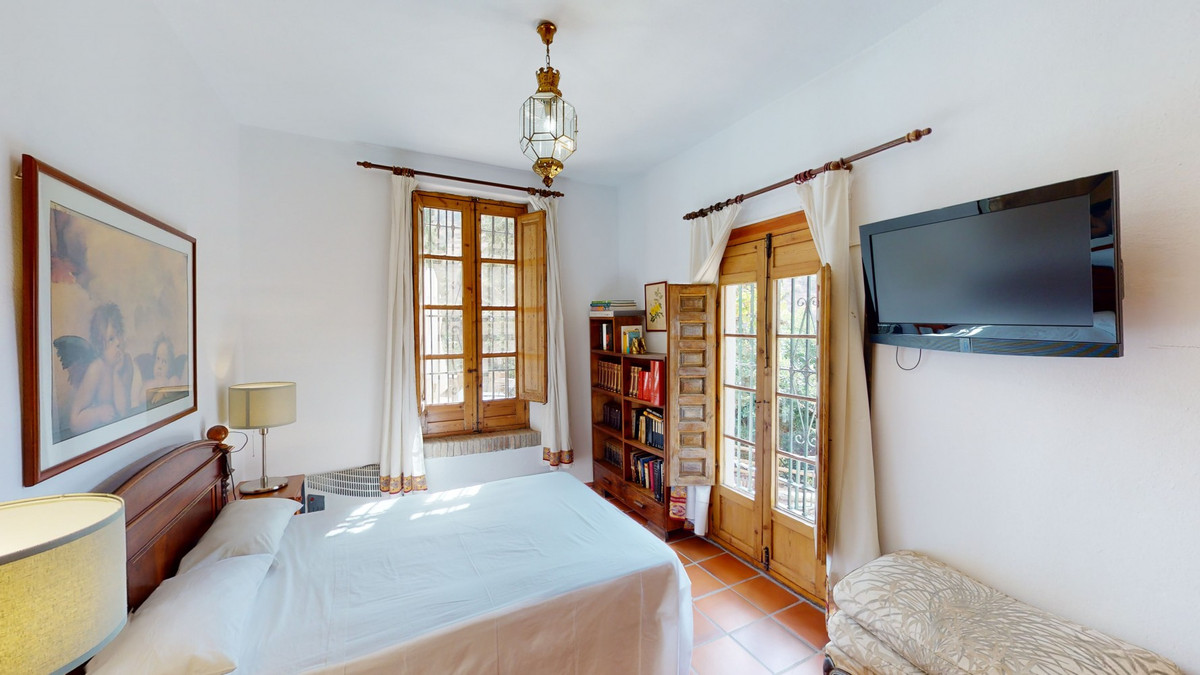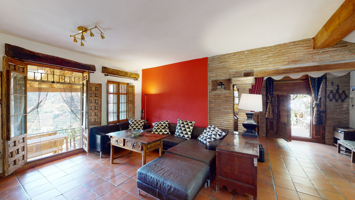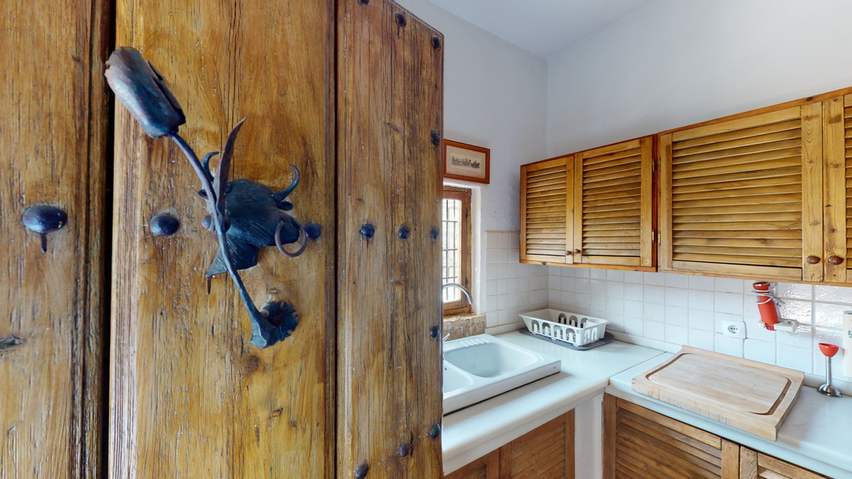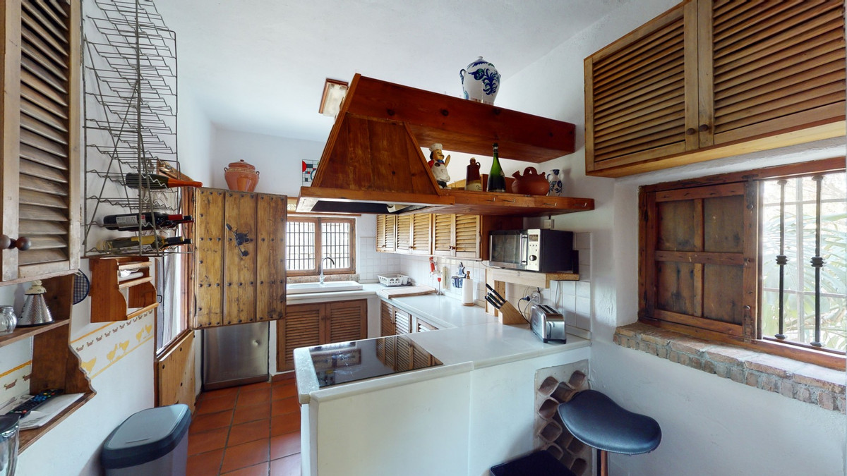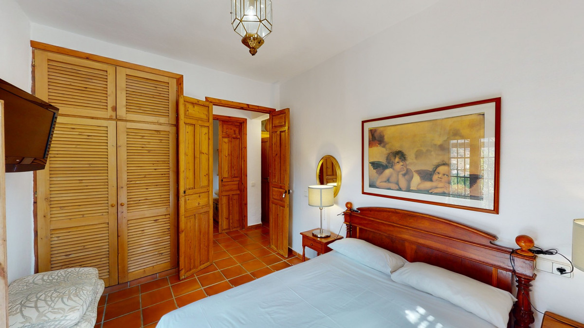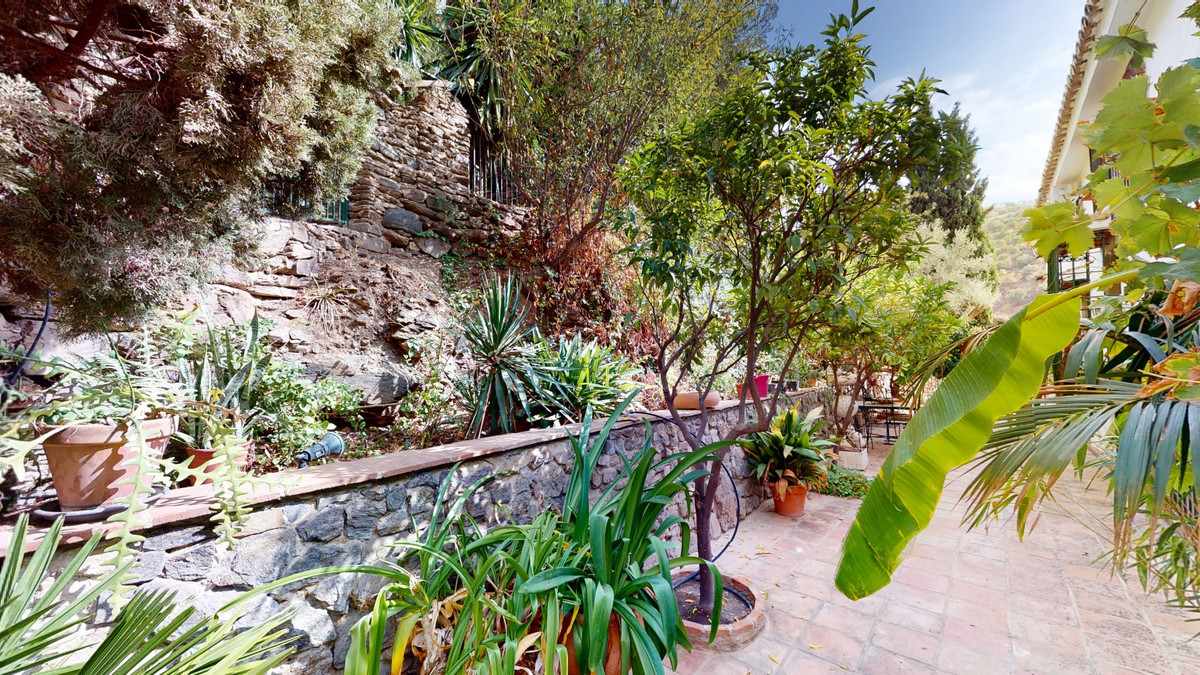 A property with charm, soul and tradition, surrounded by nature on all four sides and with panoramic views to the southwest, the valley and the surrounding mountains. It consists of two floors. The current owner built it to his liking in 1996, with top quality materials and noble woods. The estate is accessed through an electric gate and there is space to park at least three vehicles at the entrance. In front of this area, we find several tree-lined paths, for relaxed strolls, and a 500-year-old marble fountain. Going down a ramp, with little slope, covered by a leafy vine and another fountain, we access a front patio. Here is the front door; a century-old solid wood door. Upon entering, to the right, is the kitchen, fully equipped and with access to the outside covered terrace. In front of the main door is the living-dining room, very spacious, bright and with a fireplace. From the living room there is also access to the covered terrace. After the living room we access the bedroom area on the ground floor, where we find two double bedrooms, a guest bedroom, and a bathroom. Going up the stairs to the second floor there are another three bedrooms -one with a conservatory overlooking the valley and the mountains-, a bathroom with a round hydromassage bathtub and a storage room. The outdoor area has lush gardens, a beautiful pool, barbecue area, a horse arena, and its boxes. We are pleased to be able to present this dream property to you soon, either personally or via virtual viewing. Because this world, it is unique - just like our Axarquía. In Andalusia. On the Costa del Sol. Here, on the sunny side of life...
