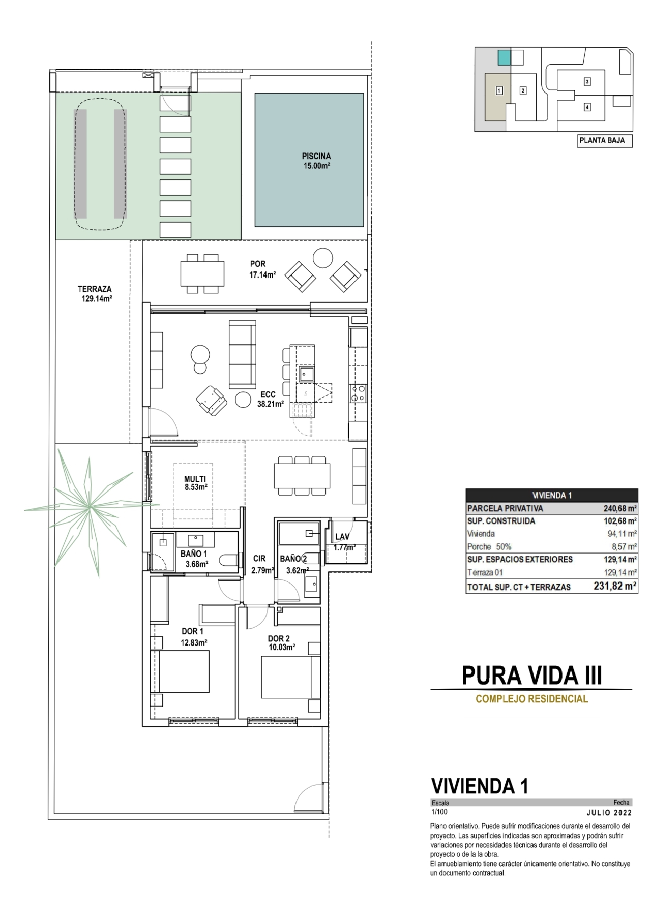 The complex is in just 300 meter to the city center of Pilar and you have the sandy beaches in Torre de la Horadad in just 3.5 km and Lo Romero golf in 6 km.