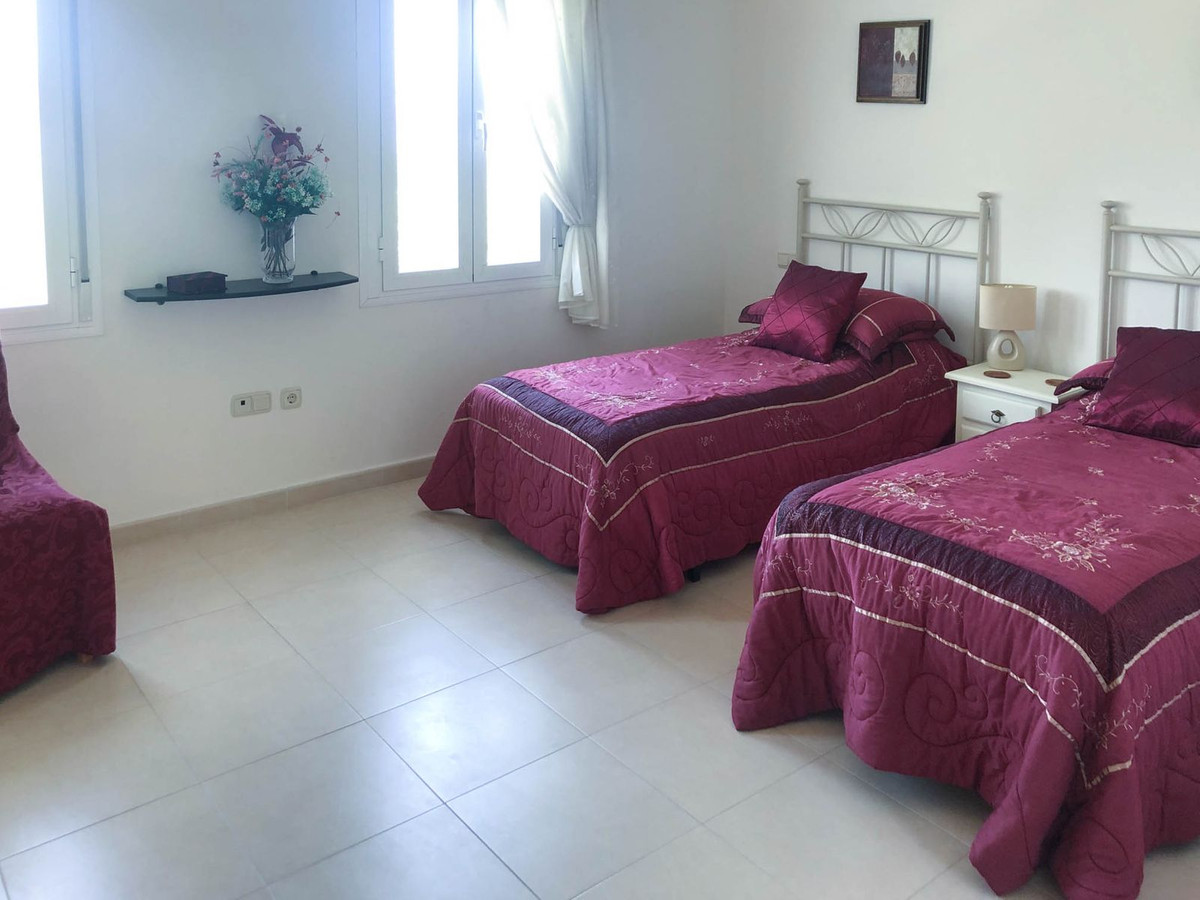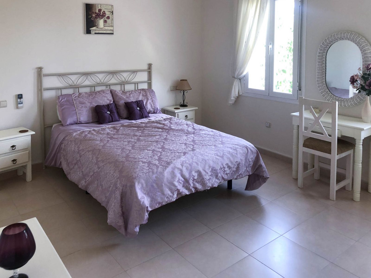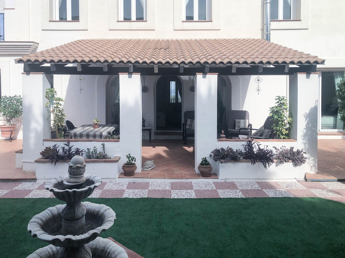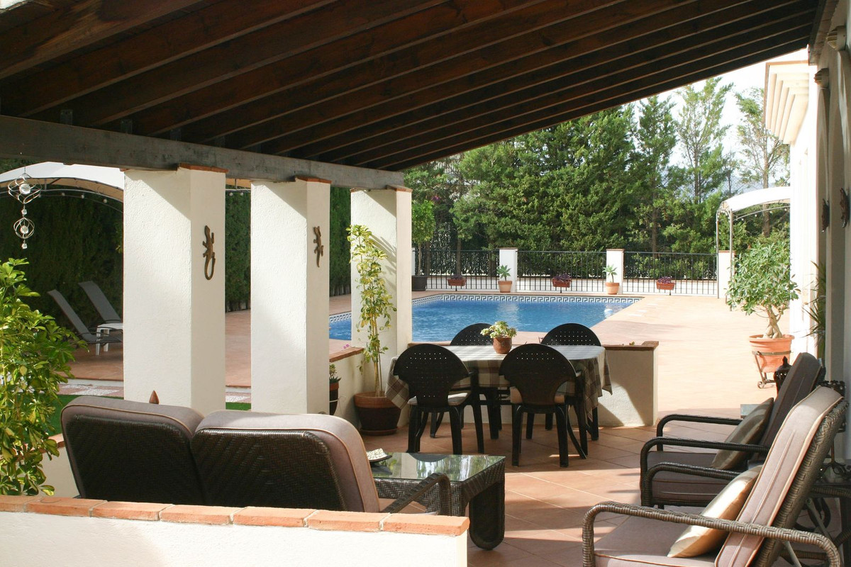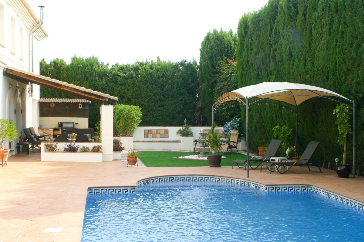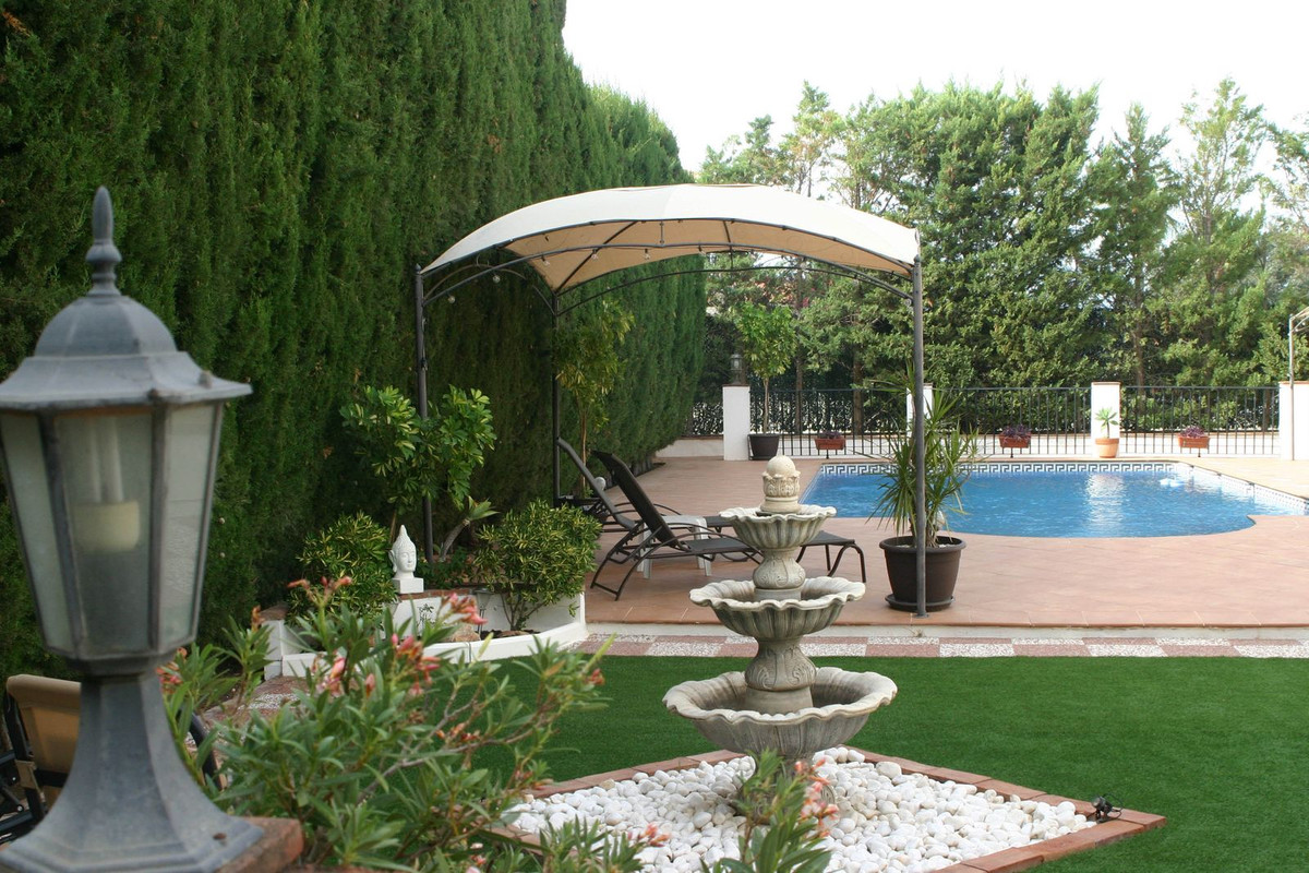 Outside, at the rear, there is a kitchen area, a large 5 x 3 meter built pergola with a tiled roof, a garden area with artificial grass, a fountain and 2 more pergolas next to the pool. The pool measures 5 meters by 9.8 meters up to the steps that take up 1.8 meters more. To the side is another terrace with planted borders, an orange tree, a lemon tree and a utility room with sink, washing machine, WC and shower. Steps take you to the lower level and driveway, where there are more planted areas, including 2 avocado trees.