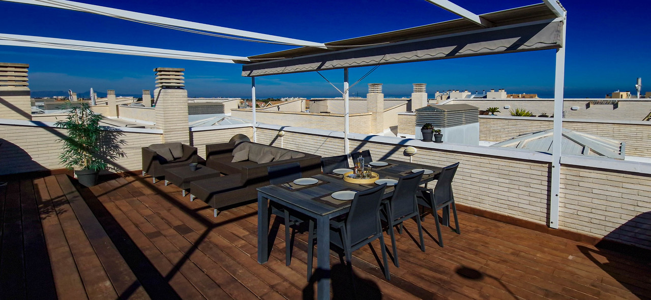 Excellent three-bedroom penthouse in Denia, in a perfect location. We present this magnificent penthouse that is less than 5 minutes walk from the beach and 10 minutes from the center and the beautiful port. Located in an urbanization with beautiful common areas and extras that few urbanizations have... apart from the community pool, it has a gym, computer room, a room for the little ones with games, community pool and free internet is offered for the entire urbanization. The house is made up of 3 bedrooms, two bathrooms, a small terrace on the main floor and a large solarium above the house with a wooden floor and a pergola that allows you to enjoy, both day and night, good times with the incredible views of the sea, the Montgo and all the mountains of Segaria. It has split air conditioning in the living room and master bedroom, as well as a large garage space and storage room included in the price. Do not miss this opportunity and contact us to visit the property and check the great potential it has.