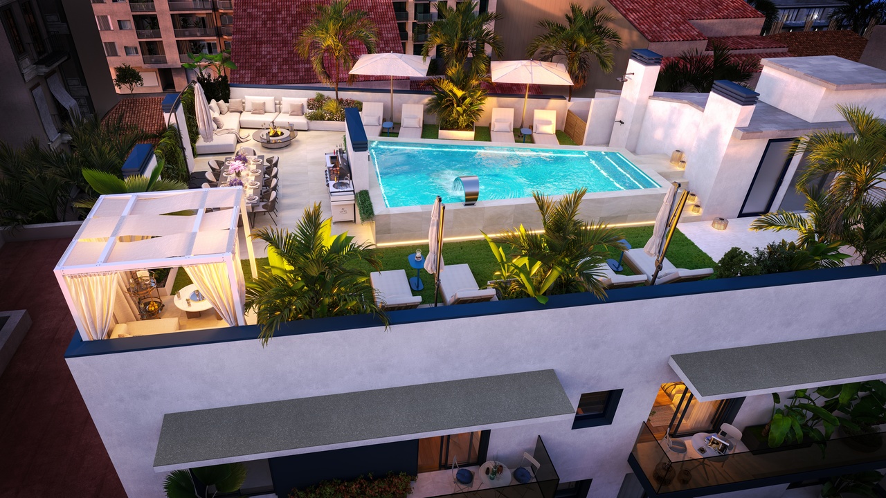 Great roof top terrace for residents with large pool of 24m2 and a water cascade, chill out area with BBQ, sofas and chaise longue to enjoy breathtaking sunsets and Mediterranean sea views!