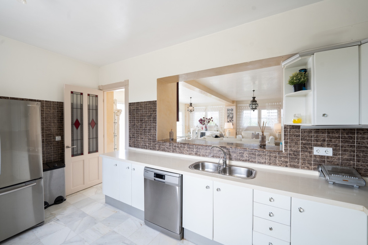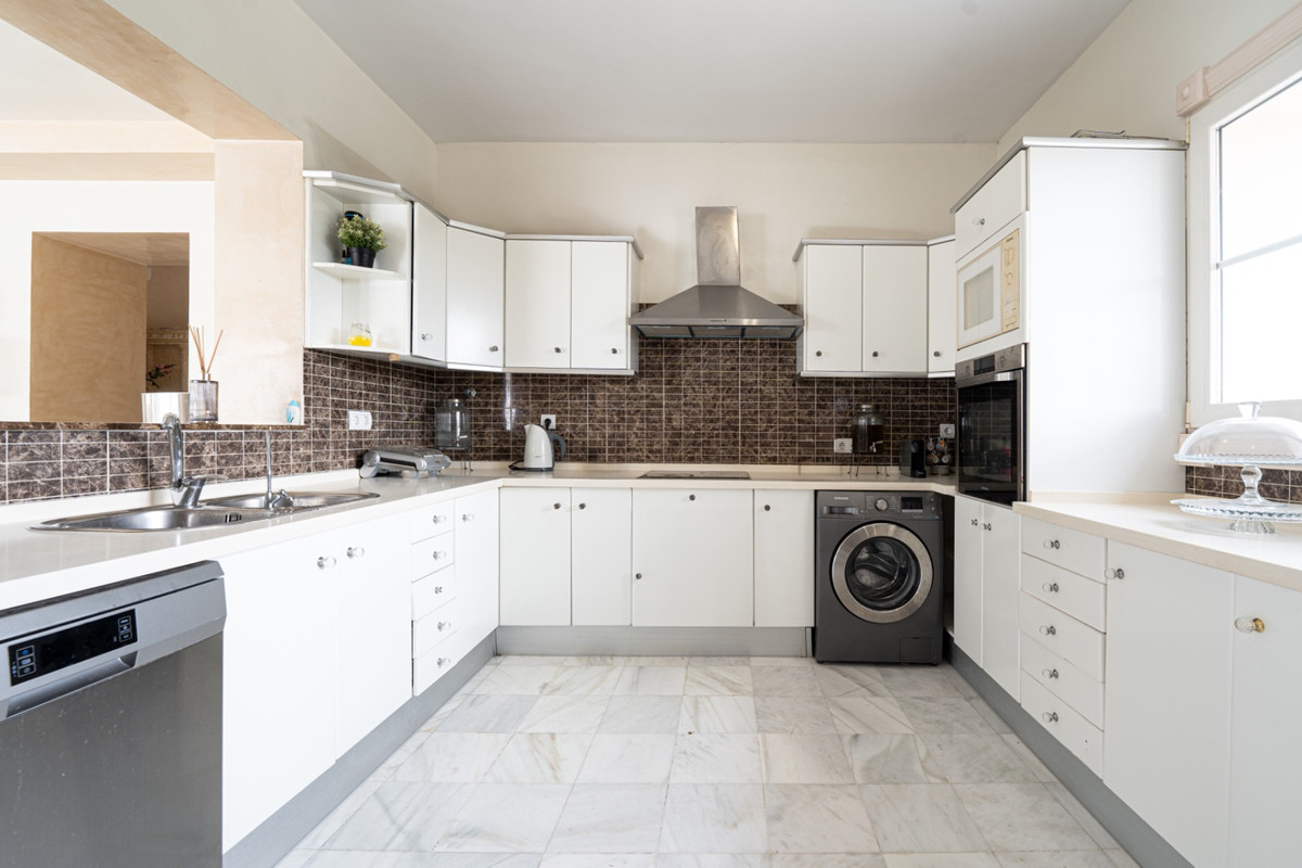 Inside, the finca features bright open living spaces with tall windows that fill the rooms with natural light. The main living area connects seamlessly to the dining space and a modern kitchen designed for entertaining. Three spacious bedrooms on the main floor and a peaceful master suite upstairs offer comfort and privacy. A rooftop terrace, private courtyard, and multiple outdoor dining areas make this home ideal for relaxed Mediterranean living.