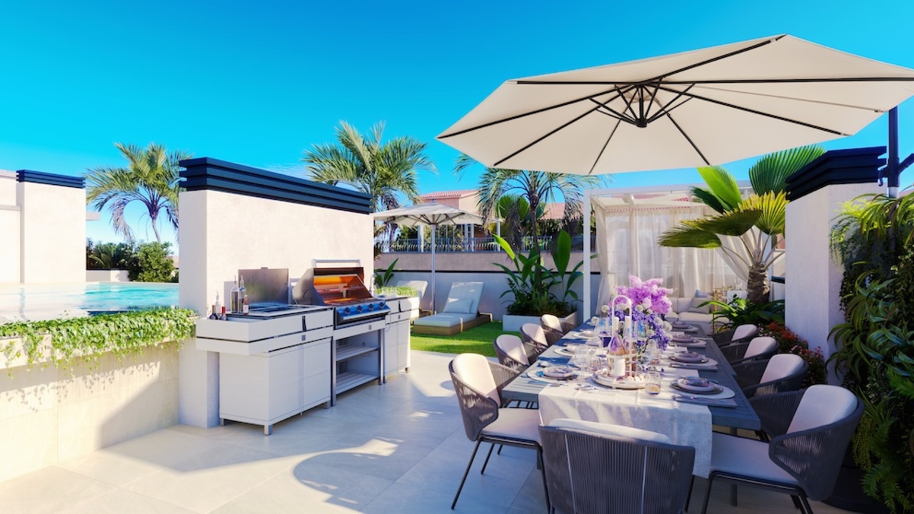Great roof top terrace for residents with large pool of 24m2 and a water cascade, chill out area with BBQ, sofas and chaise longue to enjoy breathtaking sunsets and Mediterranean sea views!
