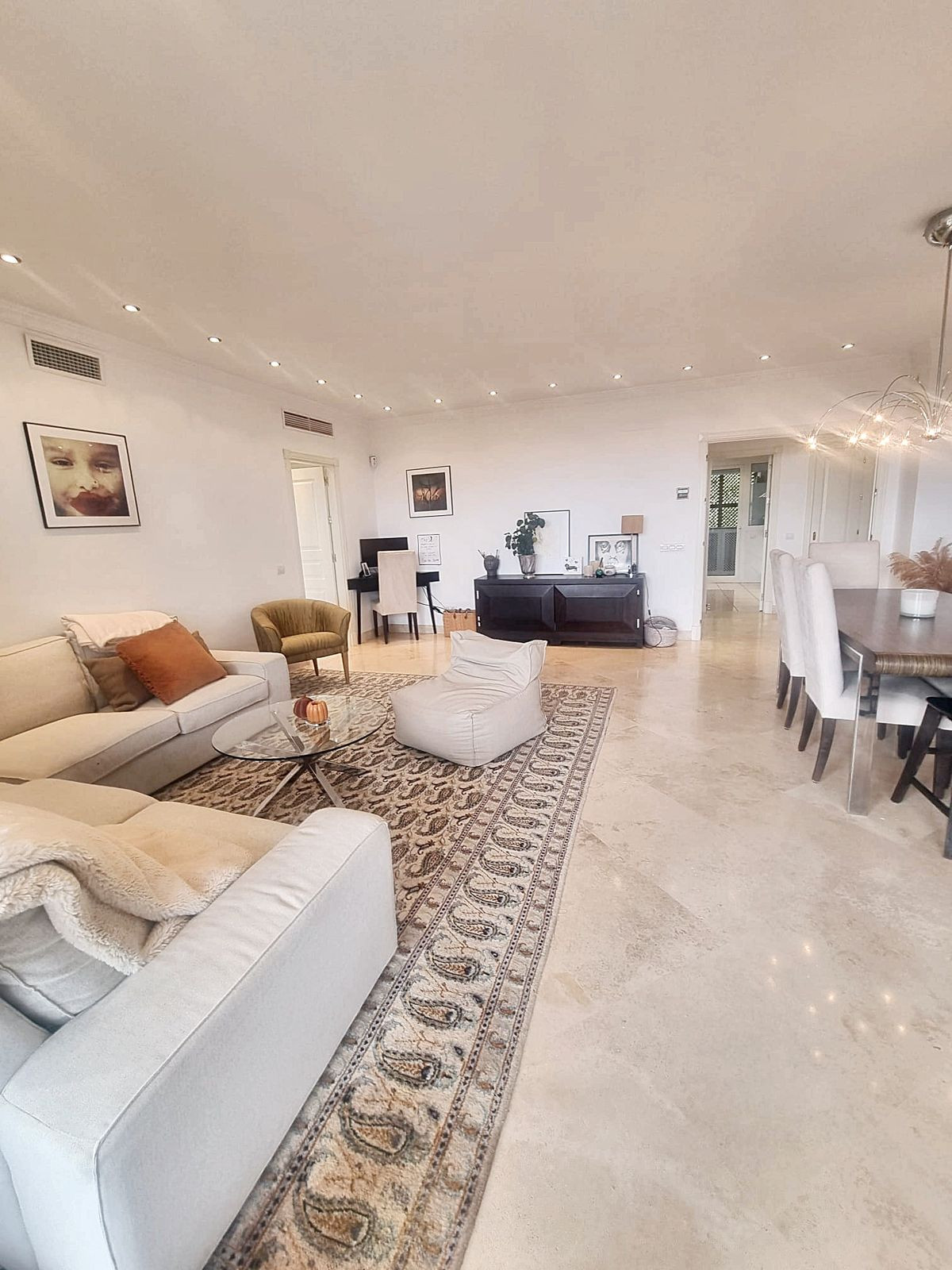 The 134m² apartment features three spacious bedrooms, including a master with an en-suite and terrace access, plus a bright living/dining room and fully fitted kitchen. Centralized air conditioning ensures comfort throughout the year.