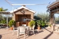 The kitchen is both inviting and practical, featuring a wood-burning fireplace and a bathroom with a shower. A spacious terrace extends from the kitchen, perfect for outdoor dining, while enclosures with awnings ensure year-round comfort in varying weather conditions.