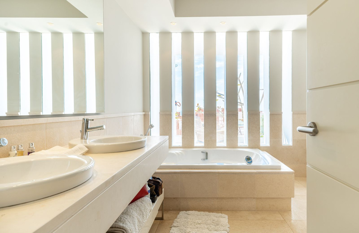 The luminious 212 m2 interior is surrounded by spacious; 95m2 terrace. The elegant living and dining area, featuring a contemporary fireplace, extends onto a vast terrace that captures breathtaking views stretching to Gibraltar—ideal for outdoor entertaining or serene relaxation.
