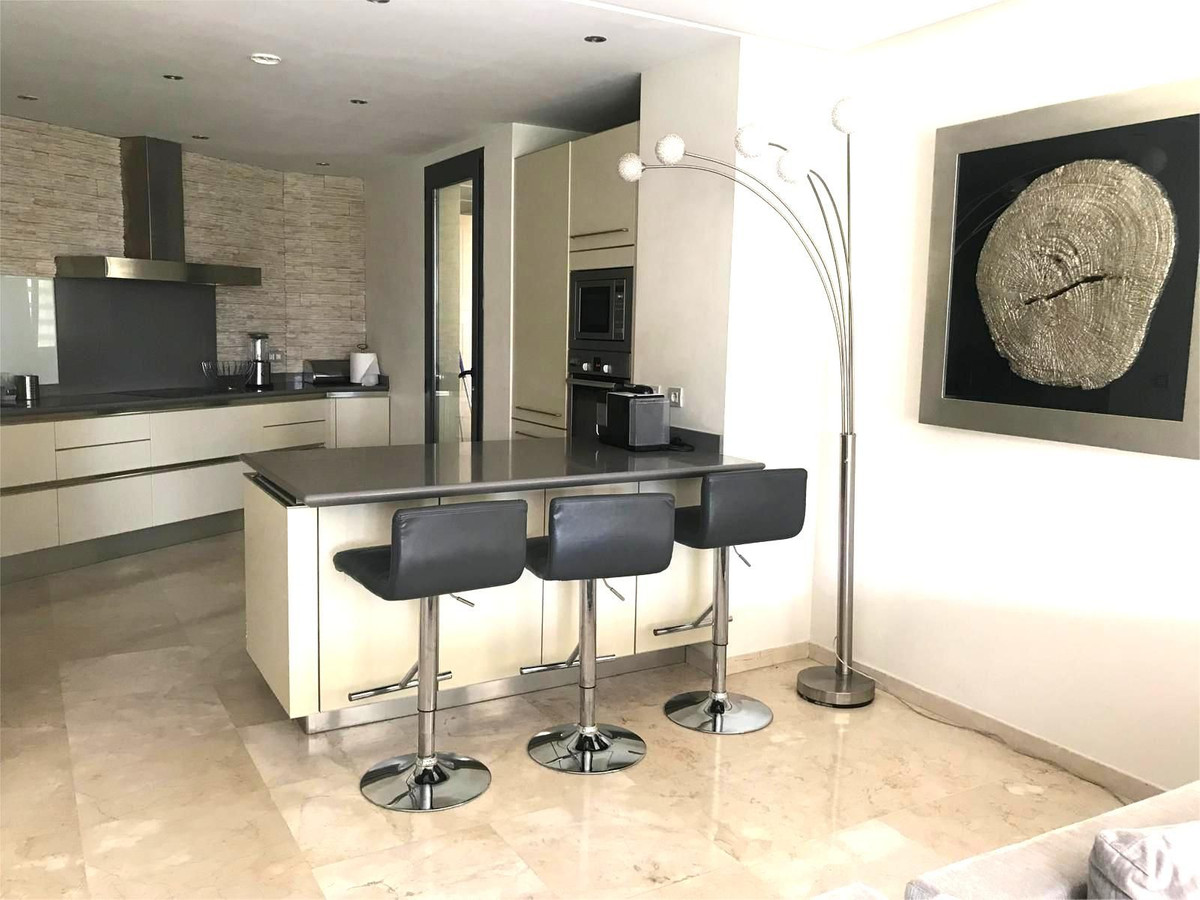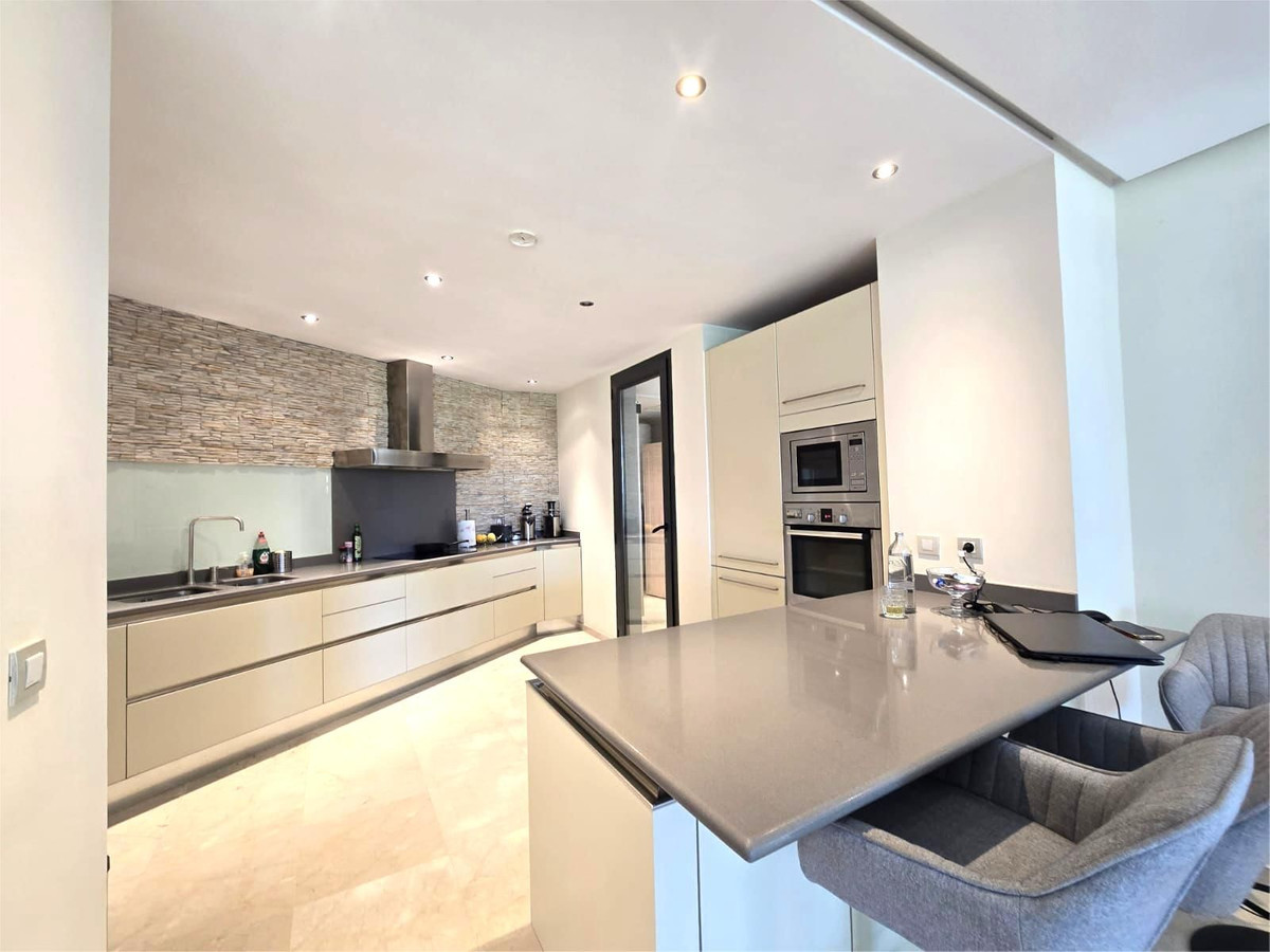 The fully equipped, modern kitchen offers premium appliances and ample storage, seamlessly combining functionality with sleek aesthetics. The master suite includes an en-suite bathroom and private access to the main terrace, offering a peaceful retreat. The second bedroom is generously sized and served by a full guest bathroom, making the layout ideal for families, guests, or home office use.