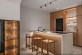 On the ground floor, the home opens up to a bright and spacious open-plan kitchen, dining, and living area. Custom-designed by a Danish studio, the kitchen is equipped with Smeg appliances and includes a stylish peninsula with a wine fridge and display cabinet. The living area is centered around a bioethanol fireplace from Pureline, adding a cozy element to the clean interior aesthetic. Large sliding glass doors connect the indoor space with a private garden terrace that includes a built-in barbecue, ideal for outdoor entertaining.