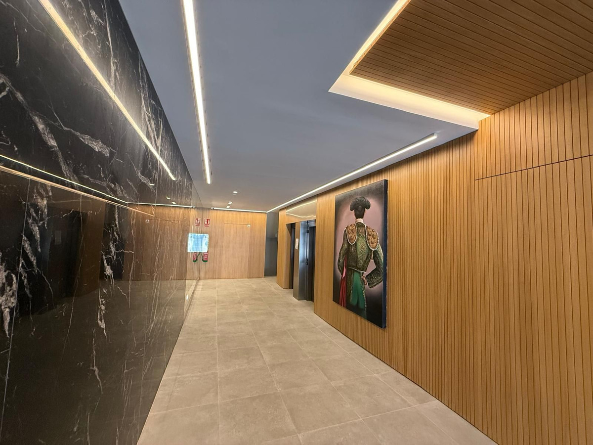 Residents of Edificio España enjoy access to exclusive communal amenities including a swimming pool, a fully equipped gym, and the property comes with a private underground parking space.