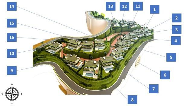 16 luxury villas of approx 869 m2 interior built, 1,048 m2 plot, 5-6 bedrooms.