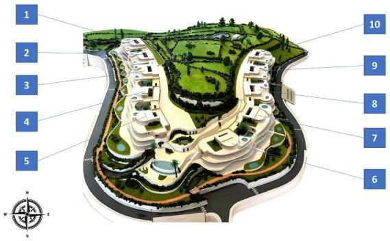 50 high-end apartments: 2, 3, and 4 bedrooms, duplex ground floor, middle floor, and duplex penthouses, from 130 to 473 m2 interior build + large terraces. Each unit has its own pool!