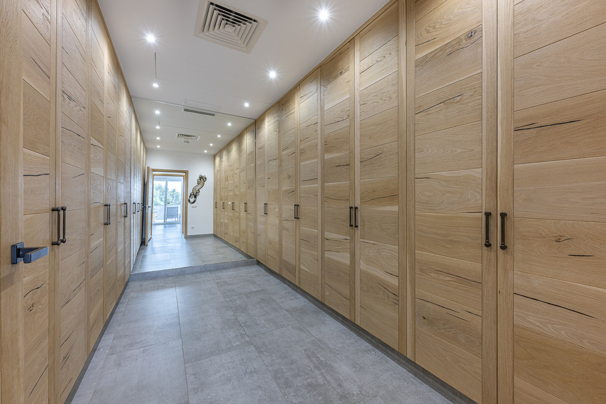 The villa’s lower pool level features a self-contained apartment with private access, offering three bedrooms, 2 bathrooms, and a shower, ideal for guests, extended family, or home office. Other features include solar panels with potential for expansion, underfloor heating, three garages, and a spacious driveway for up to five cars.