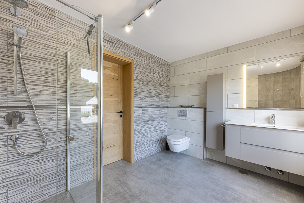 Inside, the villa feels bright, open and welcoming. The heart of the home is the spacious living room, designed with floor-to-ceiling glass doors that open directly onto the terrace, framing fantastic views of the sea and surrounding greenery. Natural light floods in from all angles, creating a warm and inviting atmosphere. The contemporary kitchen with breakfast area flows naturally into this space, making it ideal for family life and entertaining. There are four deluxe bedrooms, including a main suite with indoor and outdoor showers.
