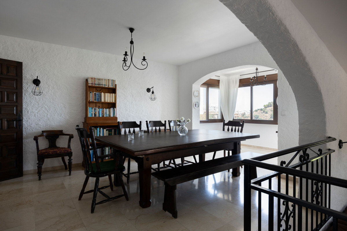 The villa welcomes you with classic Andalusian architecture and warm, open spaces designed for both relaxed living and elegant entertaining. Inside, you’ll find marfil marble floors that flow throughout the main level, enhancing the sense of luxury and natural light. The impressive open-plan living and dining room is framed by large picture windows and direct access to sunny terraces, ideal for enjoying the spectacular vistas and indoor-outdoor lifestyle.