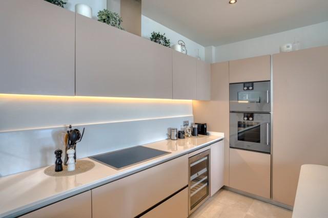The main level comprises an expansive open-plan living and dining area with floor-to-ceiling patio doors that open onto generous private terraces, showcasing spectacular views across the Mediterranean. A sleek, fully fitted kitchen with premium appliances flows effortlessly into the living space, ideal for both relaxed day-to-day living and elegant entertaining. The master bedroom suite offers direct access to the terrace, while two further guest suites and a guest cloakroom complete this floor.