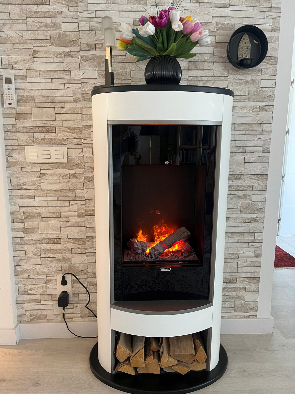•Spacious and bright living area with an elegant electric fireplace and open views of the surrounding green areas and mountains.