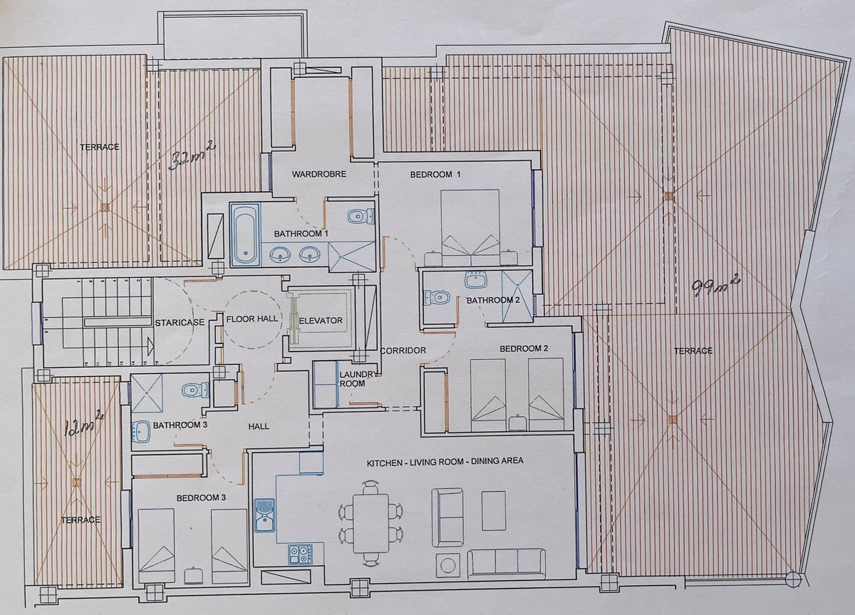 oThird bedroom is positioned on the opposite side of the entrance and includes a private terrace, perfect for guests or a home office.