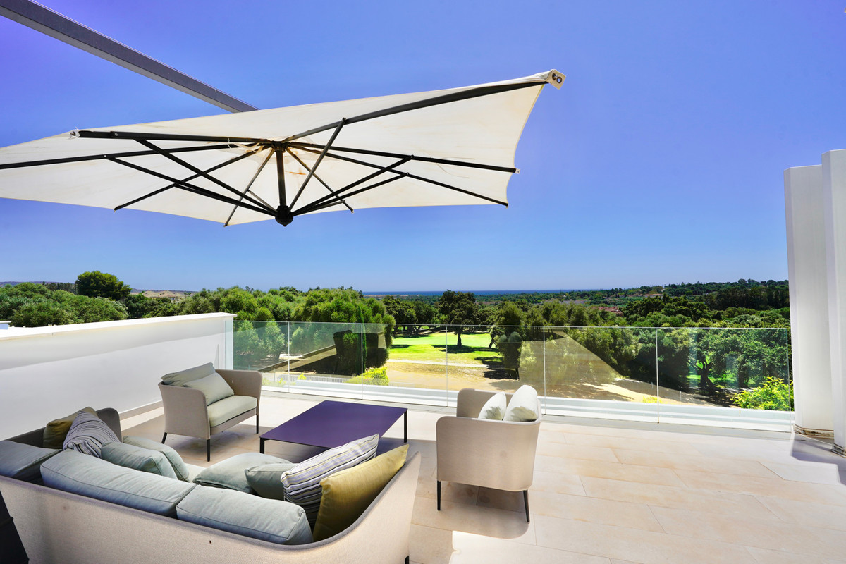 The top floor features a bright, spacious bedroom currently used as an office, a separate bathroom, and access to a vast rooftop terrace, an exceptional space for al fresco dining, lounging, or adding a private spa, all while enjoying sweeping golf and sea views.