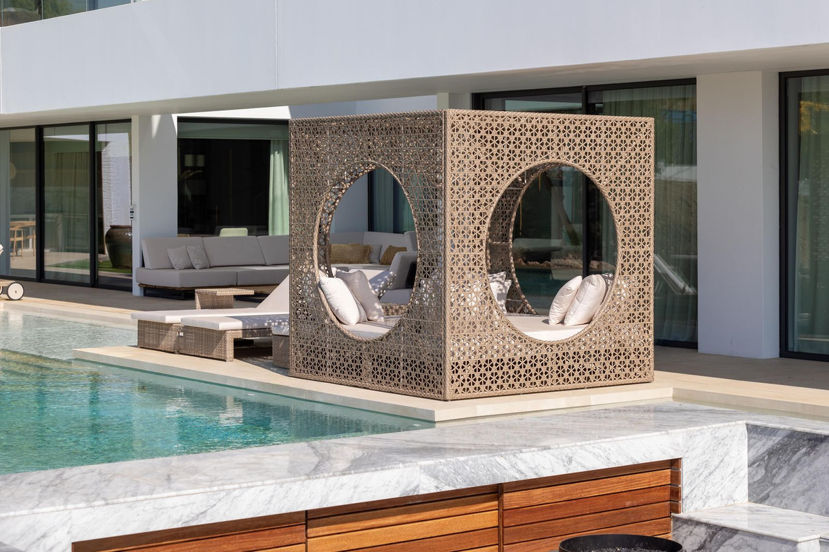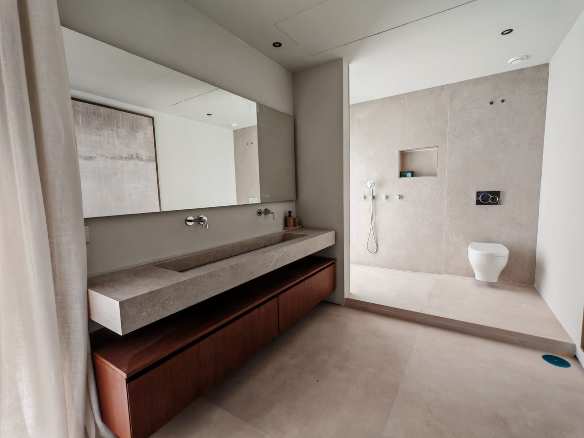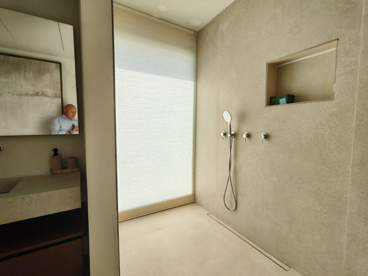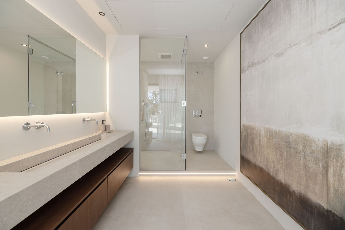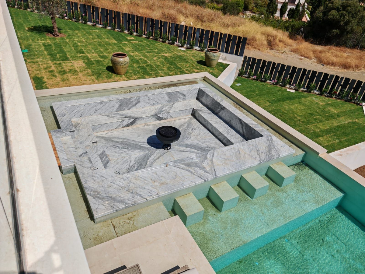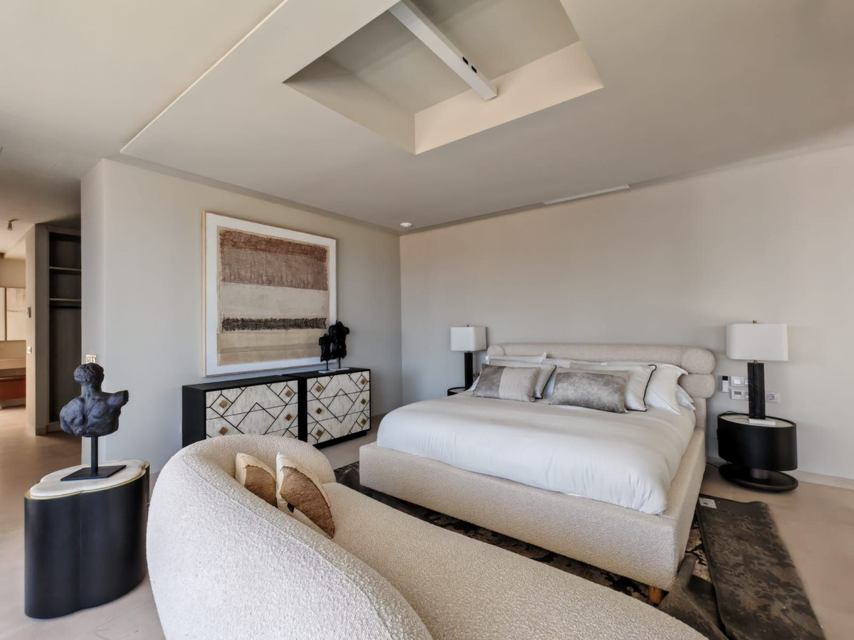 The exterior of this level is a true oasis of peace, with a swimming pool, a Carrara marble-clad spa with matching seating, and an open-air fireplace, terrace areas, a spectacular barbecue, and a beautifully landscaped garden.