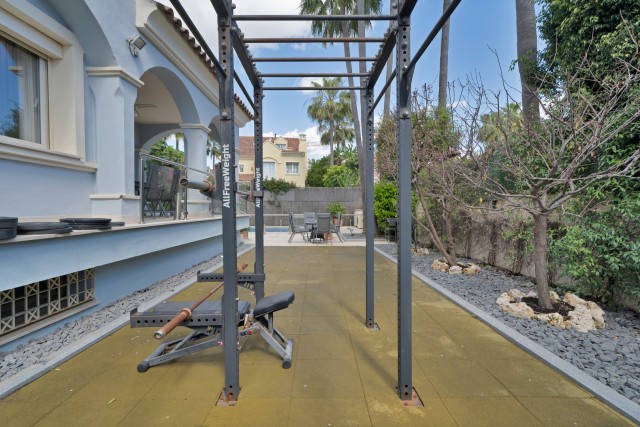 The design is keeping the original Andalusian style, but then in the inside a seamless indoor-outdoor living... The property features a private heated swimming pool, a beautifully landscaped garden, and an outdoor gym, allowing you to stay active in the fresh sea air. In the lower level, a home cinema provides the perfect entertainment space, while a carport for two cars ensures secure parking.