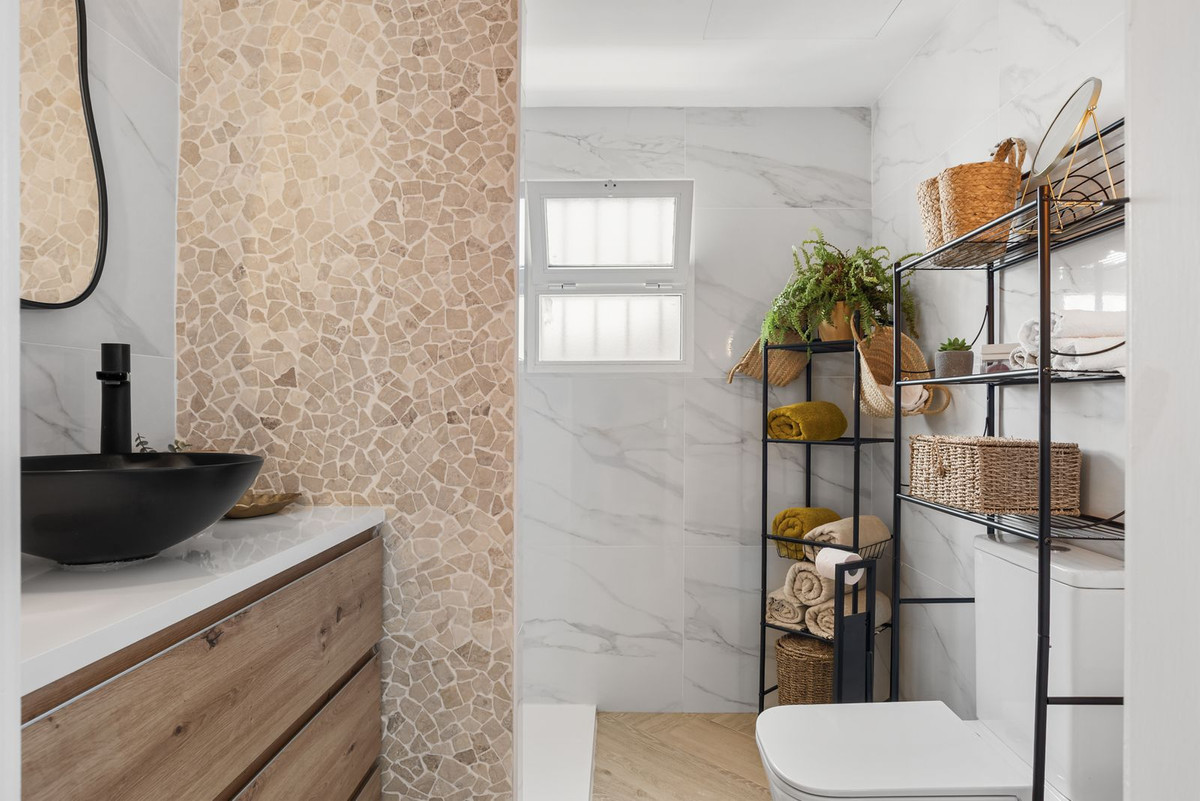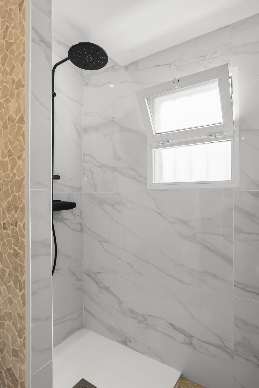On the same living level as the living room, there are two bedrooms and 2 bathrooms, one of which has been completely renovated. The other bathroom is partially renovated.