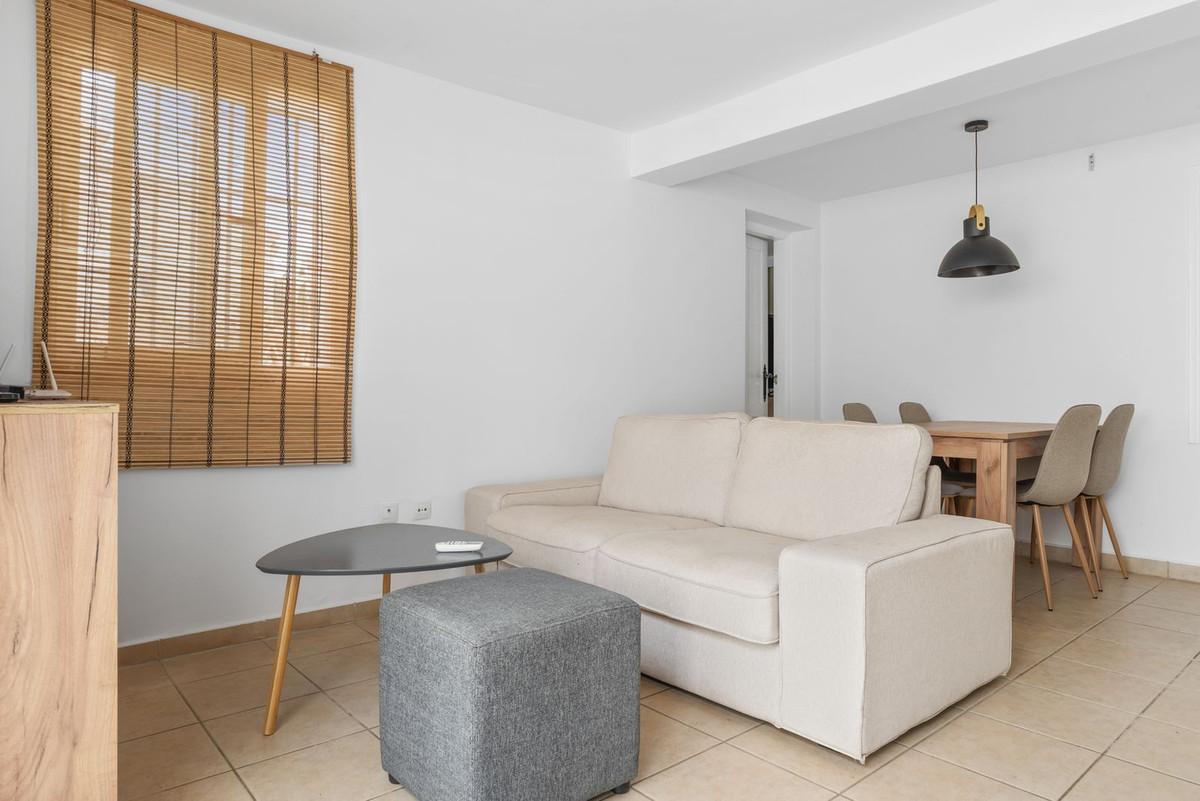 All the way down, there is a separate apartment. It has its own entrance and its own outdoor space, making it a separate residence. The apartment has a living room with an open kitchen, a bedroom, and a bathroom. This apartment was also completely renovated last year.