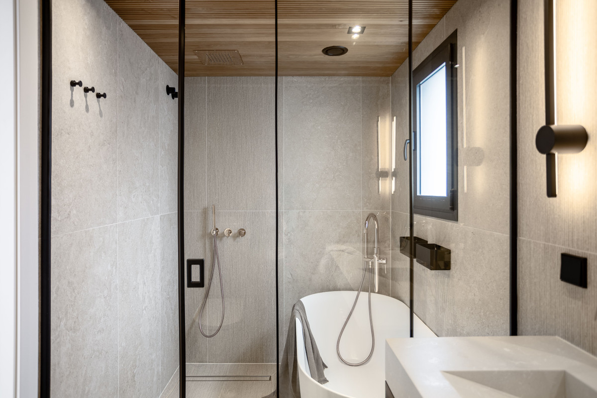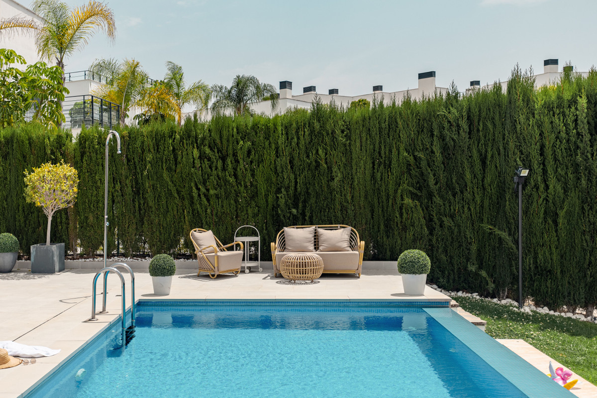 The outdoor terrace of 190m² is designed to maximize the villa’s privileged setting. It features a heated infinity pool, a fully equipped barbecue area, a shaded pergola for al fresco dining, and a comfortable chill-out space—all with breathtaking views over the sea and the African coastline. The villa features a beautifully landscaped garden with an automatic irrigation system, located directly in front of the pool area. Mature trees and well-established plants create a lush, serene environment, offering both privacy and natural beauty throughout the year.