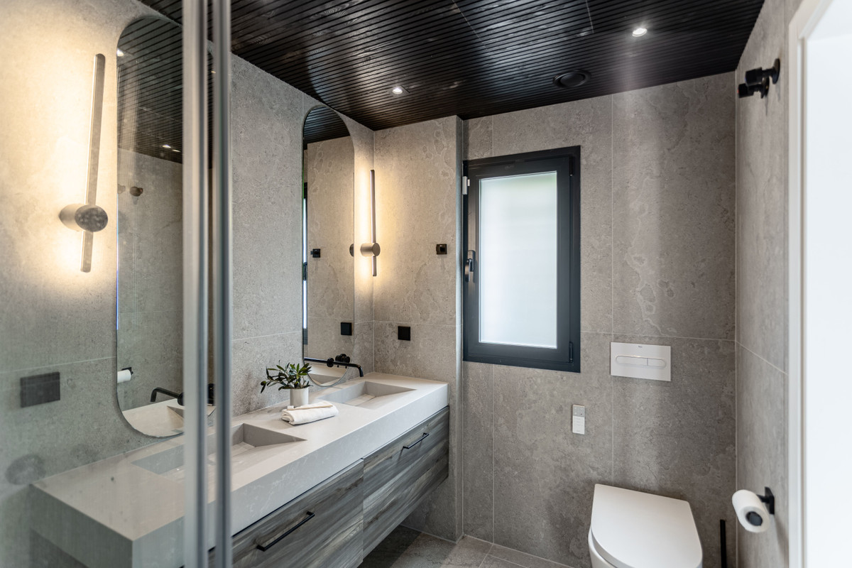 Set on a 765m² private plot, the villa offers generous interior and exterior spaces across three levels. On the main floor, you’ll find a top-of-the-line open-plan kitchen by Decodan, seamlessly connected to a spacious living area with a designer fireplace. Large integrated windows provide stunning, unobstructed views of the Mediterranean Sea from every angle. This main level also includes a complete en-suite bedroom with a private dressing area and a guest toilet.