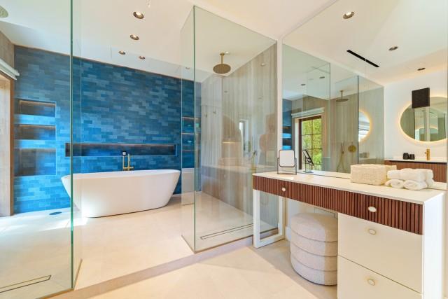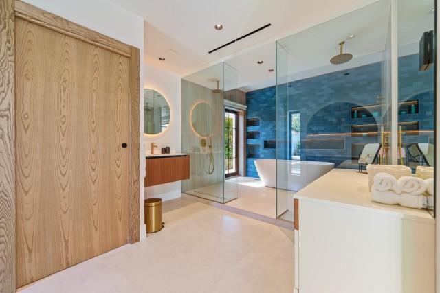 The meticulously landscaped garden is designed for both entertaining and relaxation. At the heart is a large private pool bordered by an elegant wooden deck and decorated with sun loungers and parasols. Multiple chill-out zones, a covered outdoor kitchenette with a built-in BBQ, and a stylish pergola lounge area offer a seamless al fresco lifestyle that maximises Marbella’s year-round sunshine.