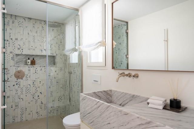 Upstairs, you’ll find two more bedroom suites, both with panoramic sea views. The principal suite offers a Mediterranean ambiance with an en suite bathroom and a chic walk-in closet, while the second suite opens onto a spacious terrace with a lounge and wet bar – the perfect setting to enjoy Marbella’s sunsets. With direct access from the community to the beachfront promenade, you can stroll to Puente Romano, Marbella Club, or even Puerto Banús. Fine dining, beach