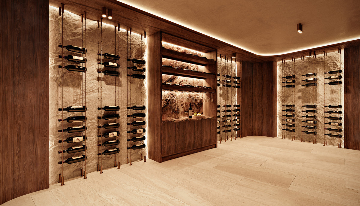 The villa also offers a whole part dedicated to entertaining, including a home cinema with XXL-screen, a climate-controlled bodega with bar area inviting socializing and enjoyment. This space is perfect for relaxing with friends and family or enjoying a quiet evening in the privacy of the property, while the integrated lighting system adds a touch of sophistication to the ambiance, both inside and on the covered terraces.