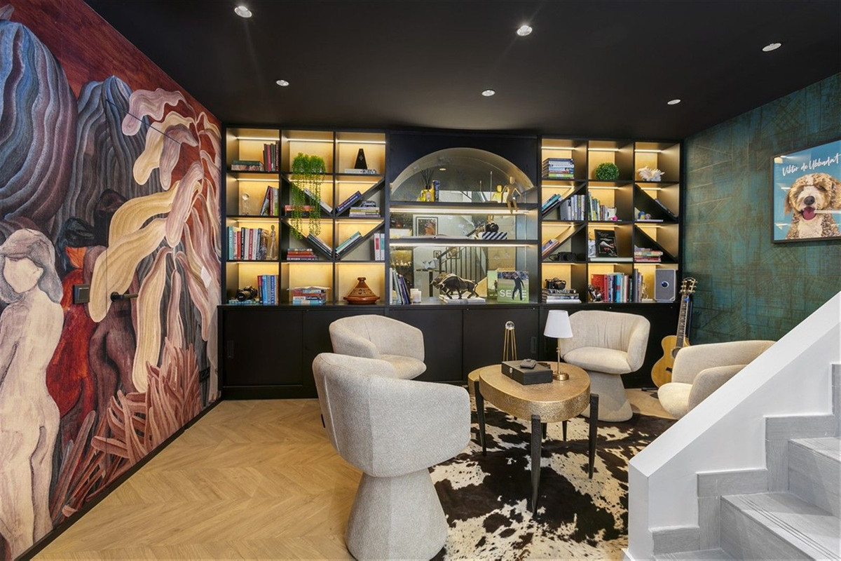 The lower level boasts a luxurious lounge featuring designer shelving, custom lighting, and statement décor. Chic and intimate, it’s the perfect space for relaxation or entertaining.
