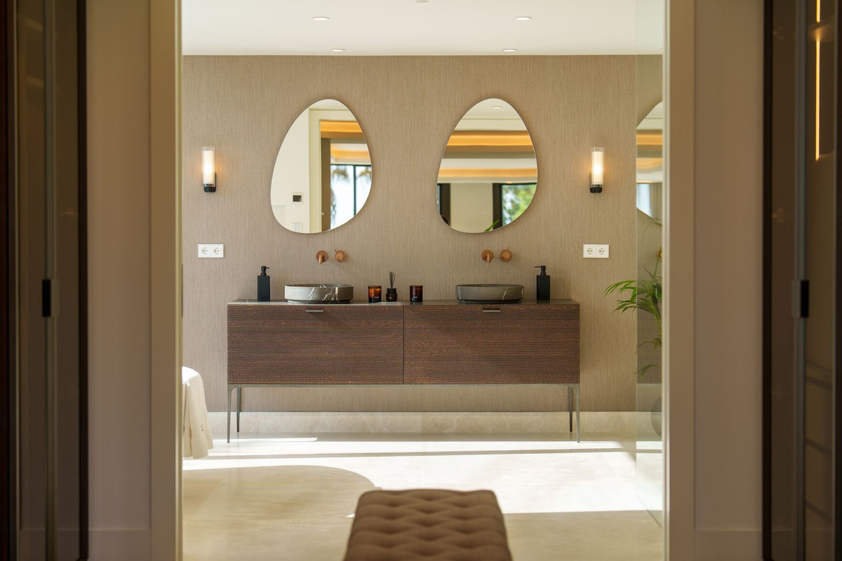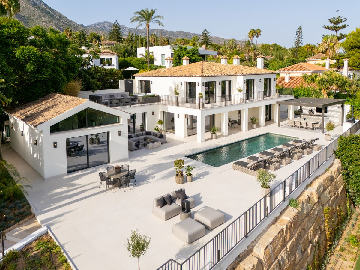 This fully renovated Andalusian-style villa is set in Rocío de Nagüeles, one of the most prestigious enclaves of Marbella’s Golden Mile. Positioned on a 1,965m² south-facing plot beneath the emblematic La Concha mountain, it captures sweeping views of the Mediterranean. Modernised in 2025, the residence extends over 734m², where soaring ceilings, floor-to-ceiling glazing, and fluid indoor-outdoor transitions highlight its luminous design.