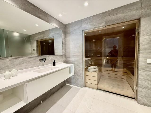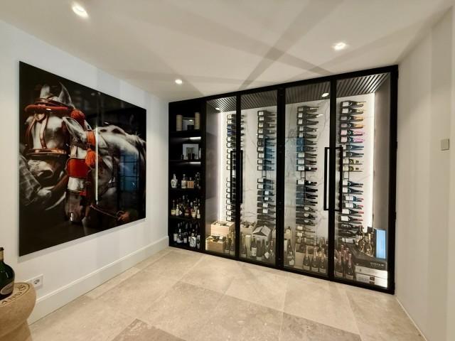 The lower floor mirrors the amenities of Marbella’s most exclusive estates. A full-size indoor pool with natural light, a sauna and shower area, and a professionally equipped gymnasium create a private wellness retreat. This level also includes a wine bodega, home cinema, laundry room, and a garage for 2–3 cars with a separate private entrance, plus ample storage.