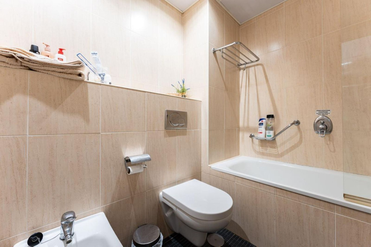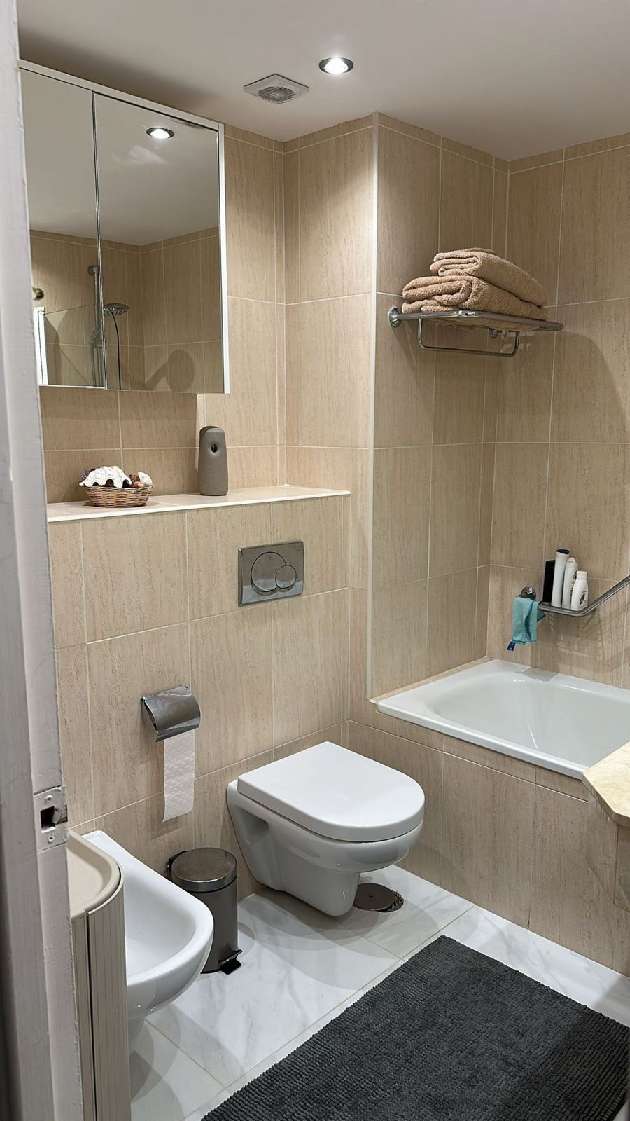 The apartment features two spacious double bedrooms, each with ample wardrobe space, and two contemporary bathrooms, one of which is en-suite. The open-plan living and dining area is filled with natural light, creating a warm and welcoming atmosphere. The fully equipped modern kitchen comes with quality appliances and plenty of storage, making it both functional and stylish.