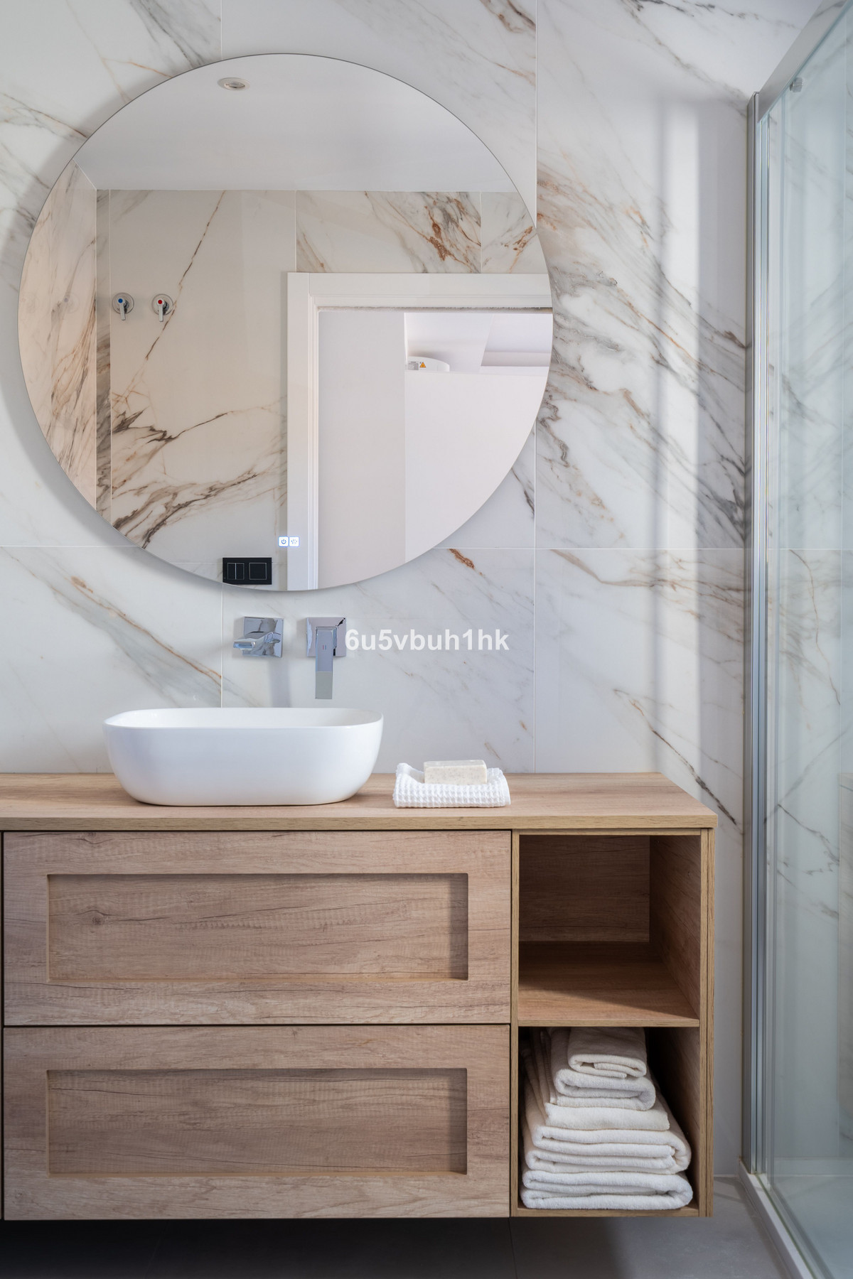A staircase with led lights and sensors leads up to the first floor with two ensuite bedrooms. The first bedroom is large with plenty of built in wardrobes and a terrace with stunning sea views. The ensuite bathroom is stylish and a perfect size. The second bedroom also has built in wardrobes and a modern bathroom.