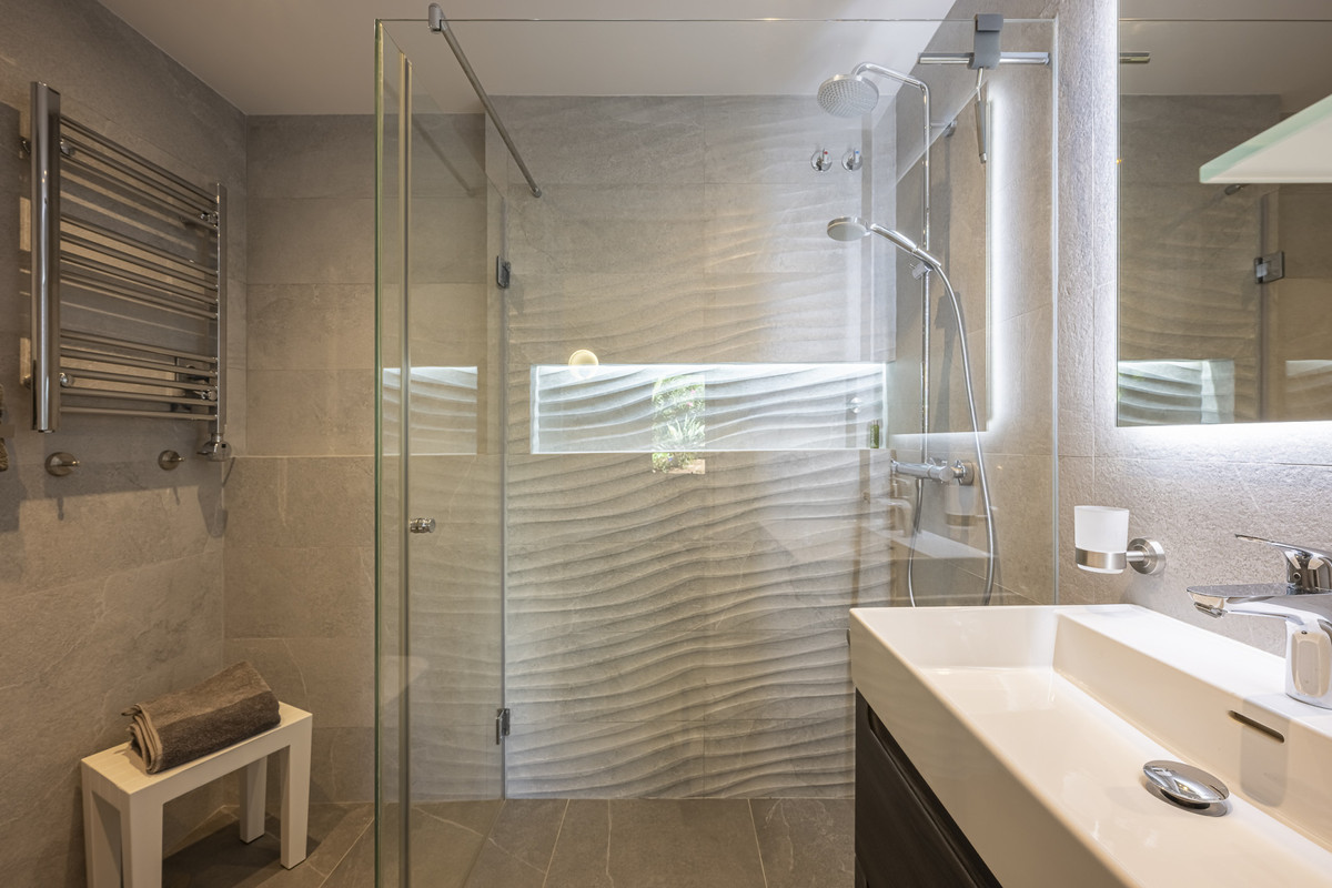 Inside, you'll find three bedrooms and three bathrooms (two en-suite). The living room transitions into an open-plan dining area and kitchen, featuring a breakfast bar and ample storage space. There's a modern fireplace for cooler evenings, and the main bedroom comes with a walk-in wardrobe - proper storage space that you'll appreciate when you're not living out of suitcases. The 20-square-metre covered terrace has space for a dining table and seating area, allowing you to dine outside for most of the year. All bathrooms are contemporary, and the entire property features neutral tones that won't date quickly.
