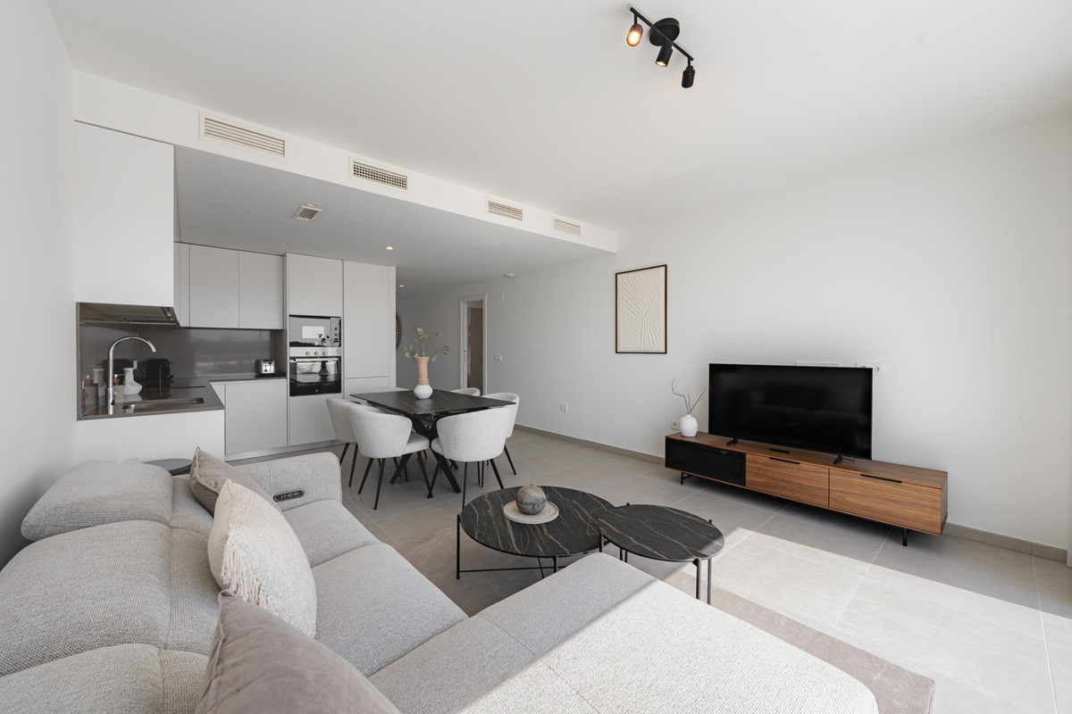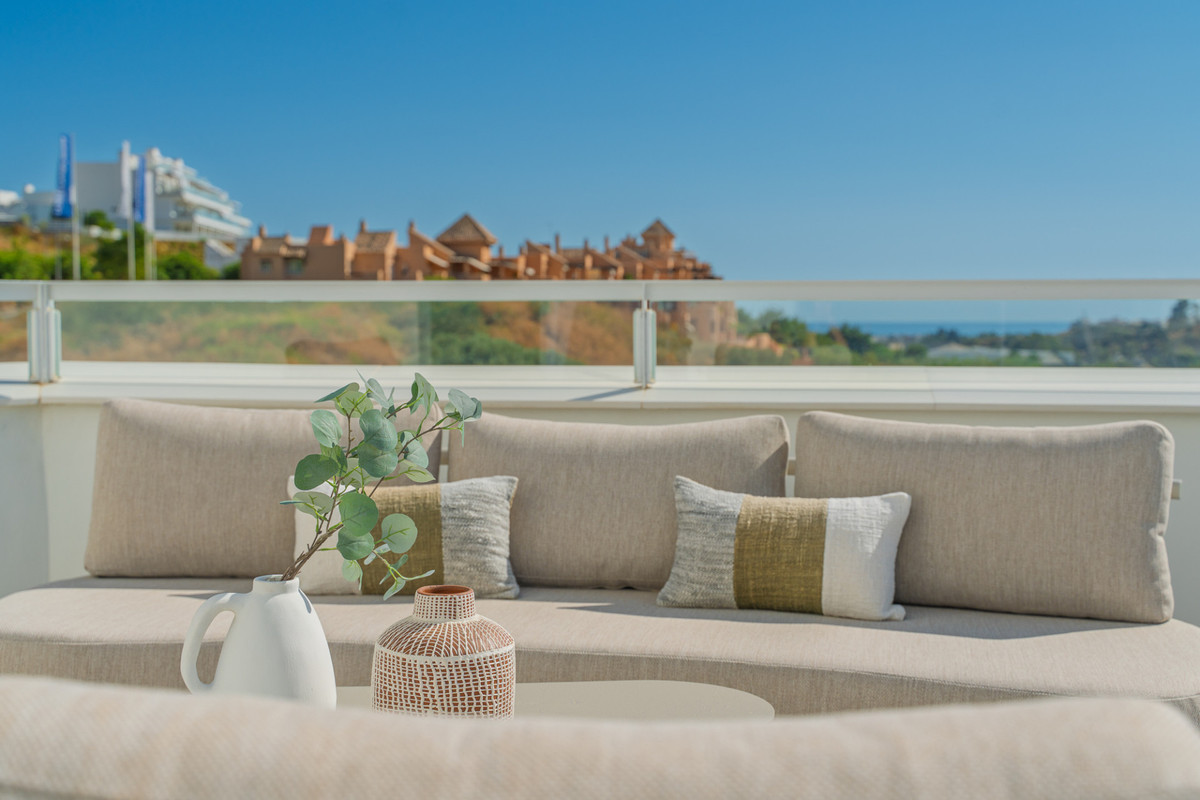 Discover this stunning second-floor duplex penthouse, offering breathtaking panoramic views of the sea and mountains. The home features a spacious living room terrace and a rooftop terrace with a private solarium and elegant white pergola, perfect for enjoying the Mediterranean sun in complete privacy.