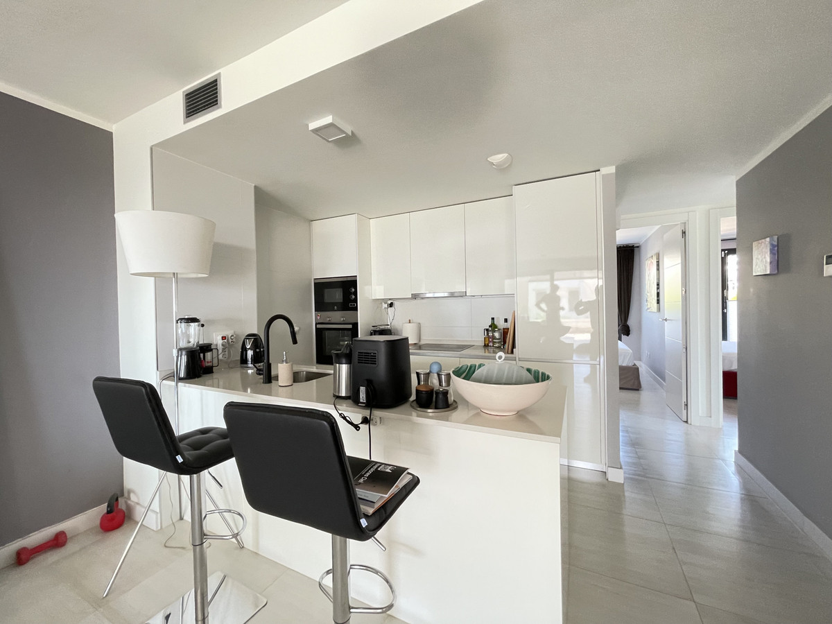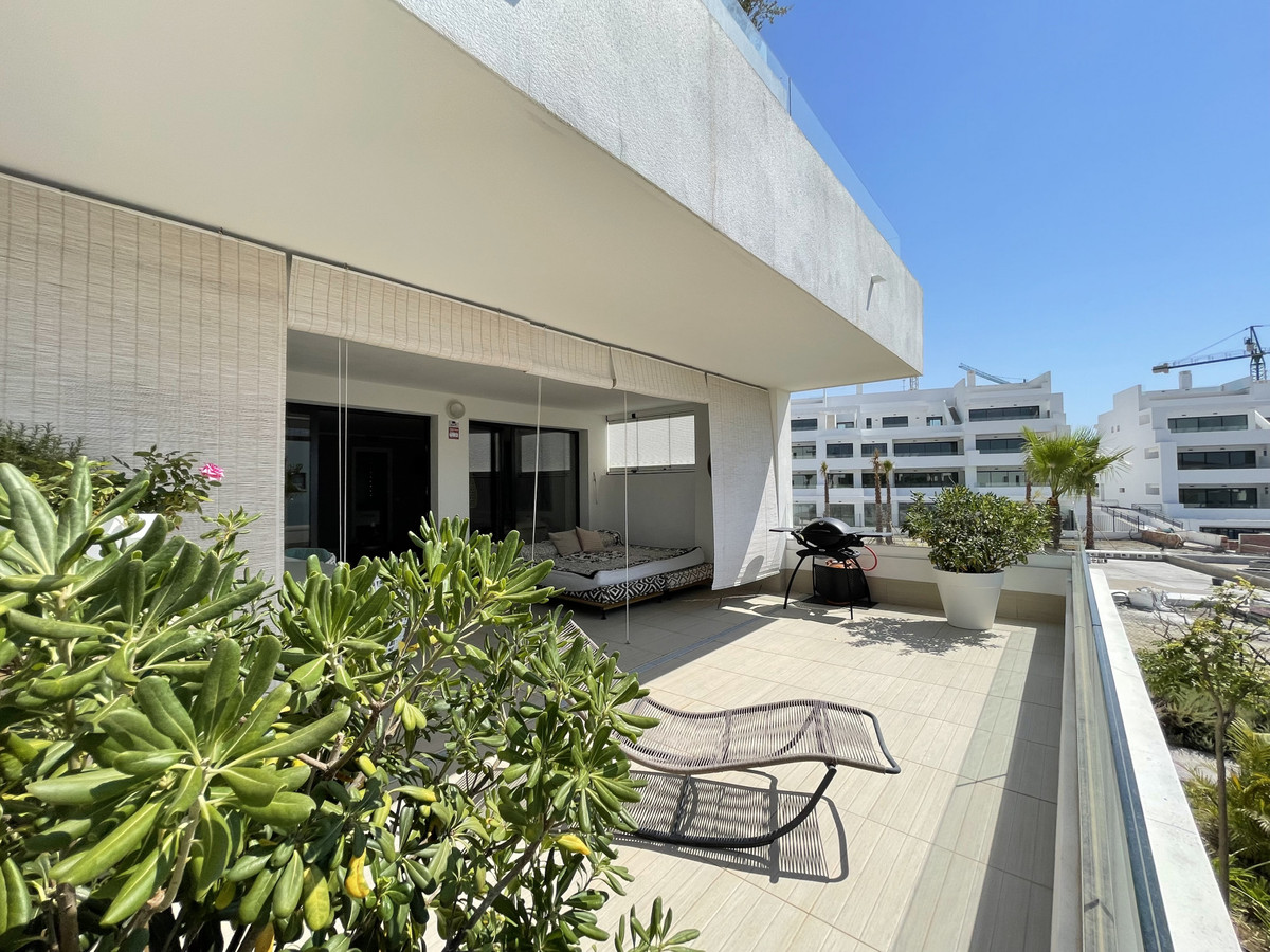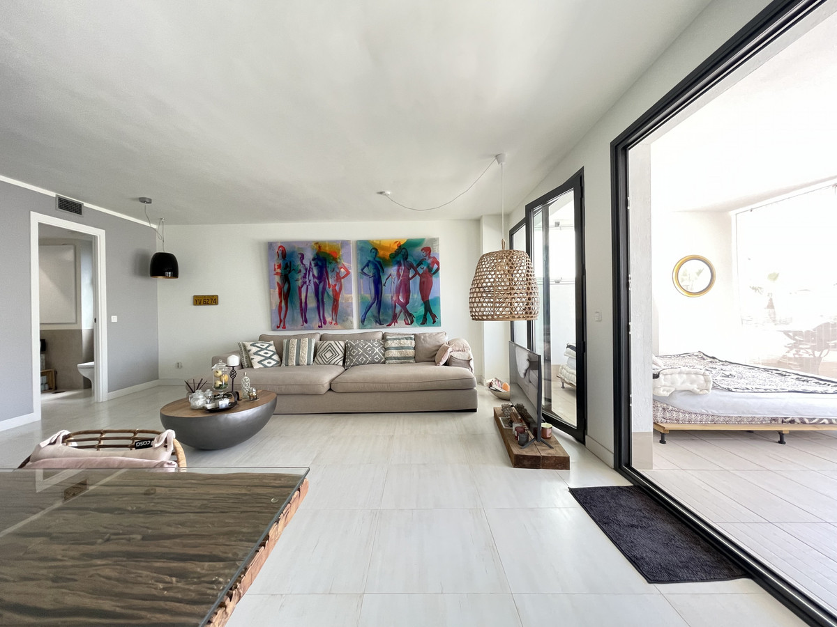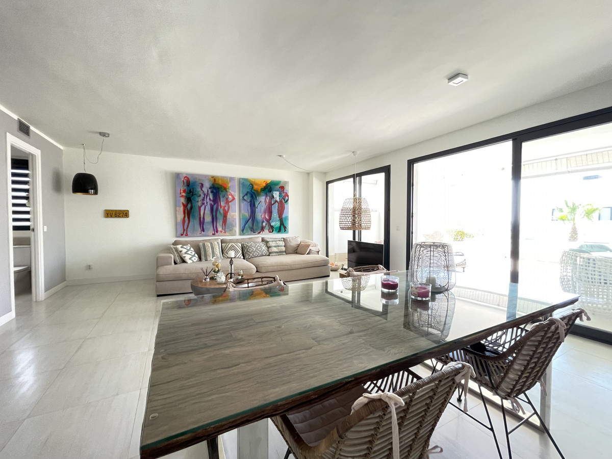 We present this exceptional ground floor apartment located in the sought-after area of Las Olas, in West Estepona. The property, with a built area of 182m² and 90m² of interior space, stands out for its transformation from the original three bedrooms to a modern two-bedroom design, allowing you to enjoy a 30m² living room, providing greater space and comfort to the living area.