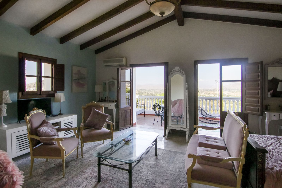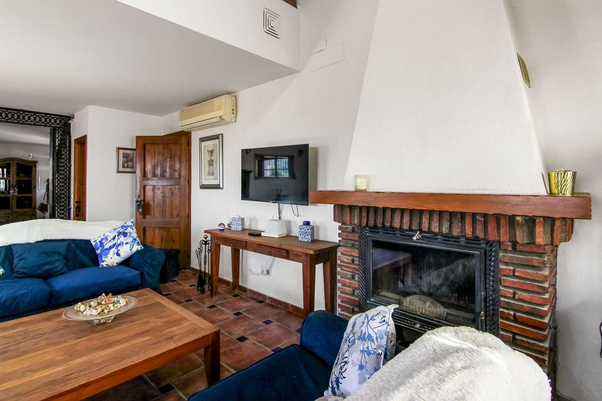 Living room is breathtaking, very spacious with high ceiling and big fireplace. Rustic style beautiful wooden framed windows, and indoor shutters, views to the countryside. A lot natural light and access to the outdoor Andalucian patio, where you can continue to the outdoor terrace. There is a potential and space to make a plunge pool. A lot of options for this idea.