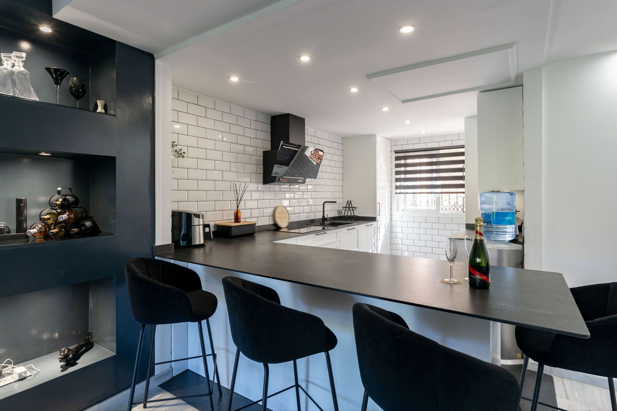 Main floor: Bright living room with an electric feature fireplace and direct access to a private 17m² terrace boasting lovely mountain views. On this level you will also find the fully fitted open-plan kitchen and a guest cloakroom.